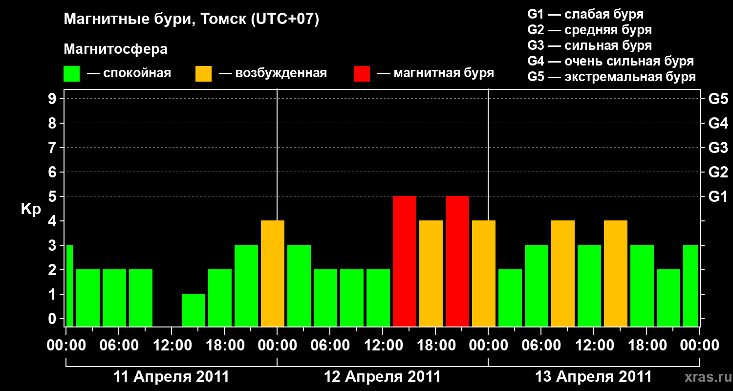 Изменения геомагнитного индекса Kp с 11 по 13 апреля 2011 года для средних широт