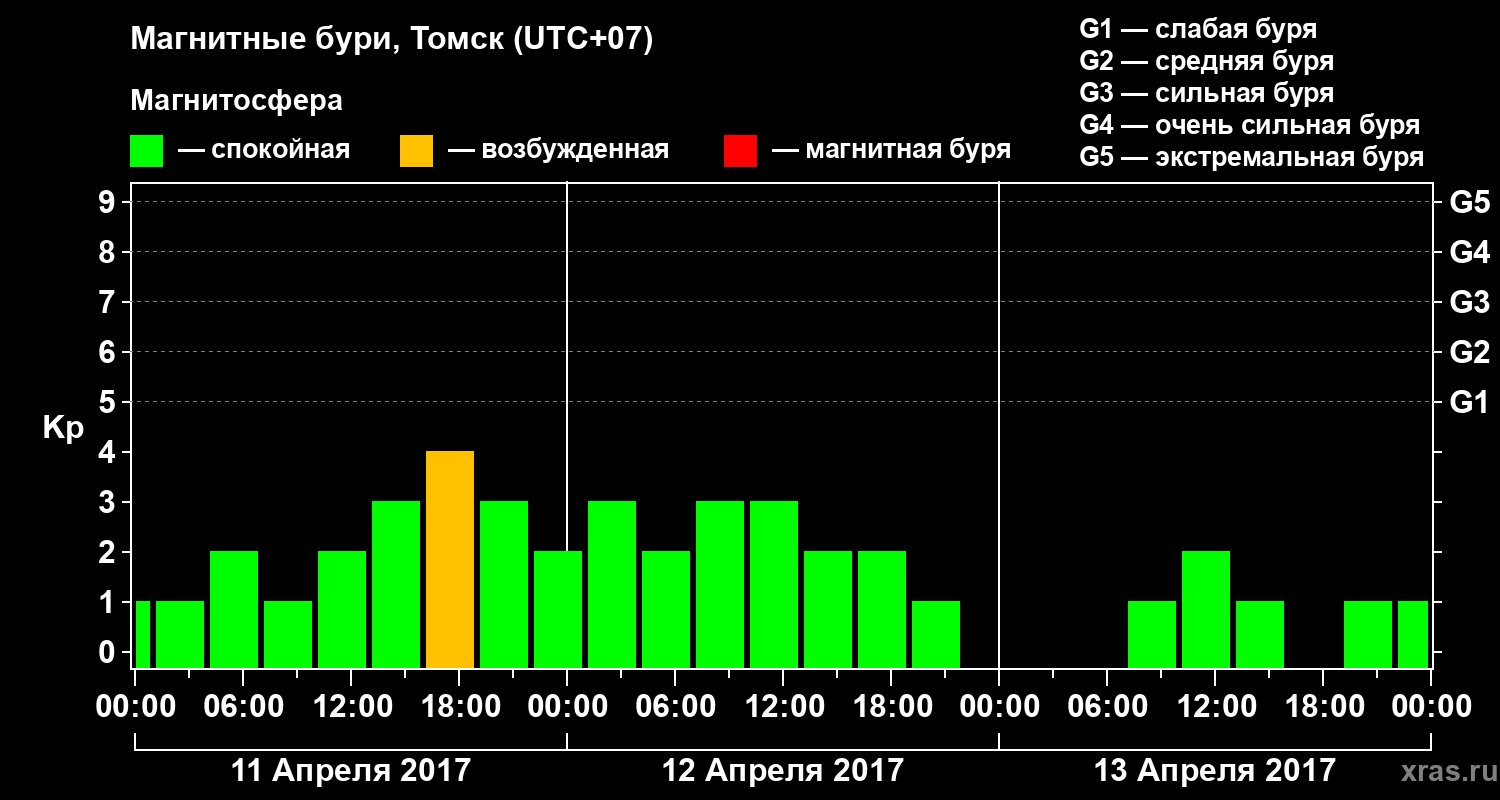 Изменения геомагнитного индекса Kp с 11 по 13 апреля 2017 года для средних широт