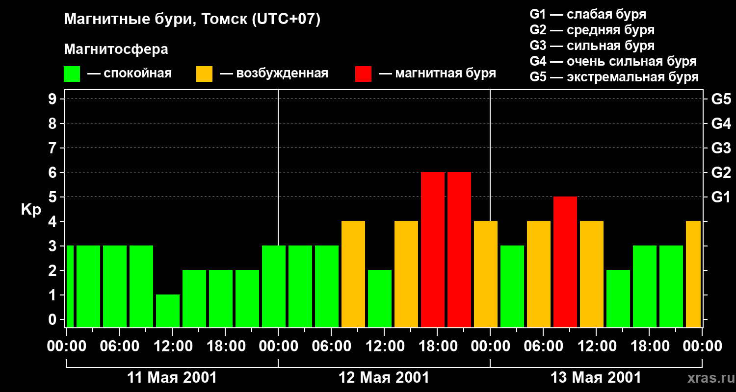 Изменения геомагнитного индекса Kp с 11 по 13 мая 2001 года для средних широт