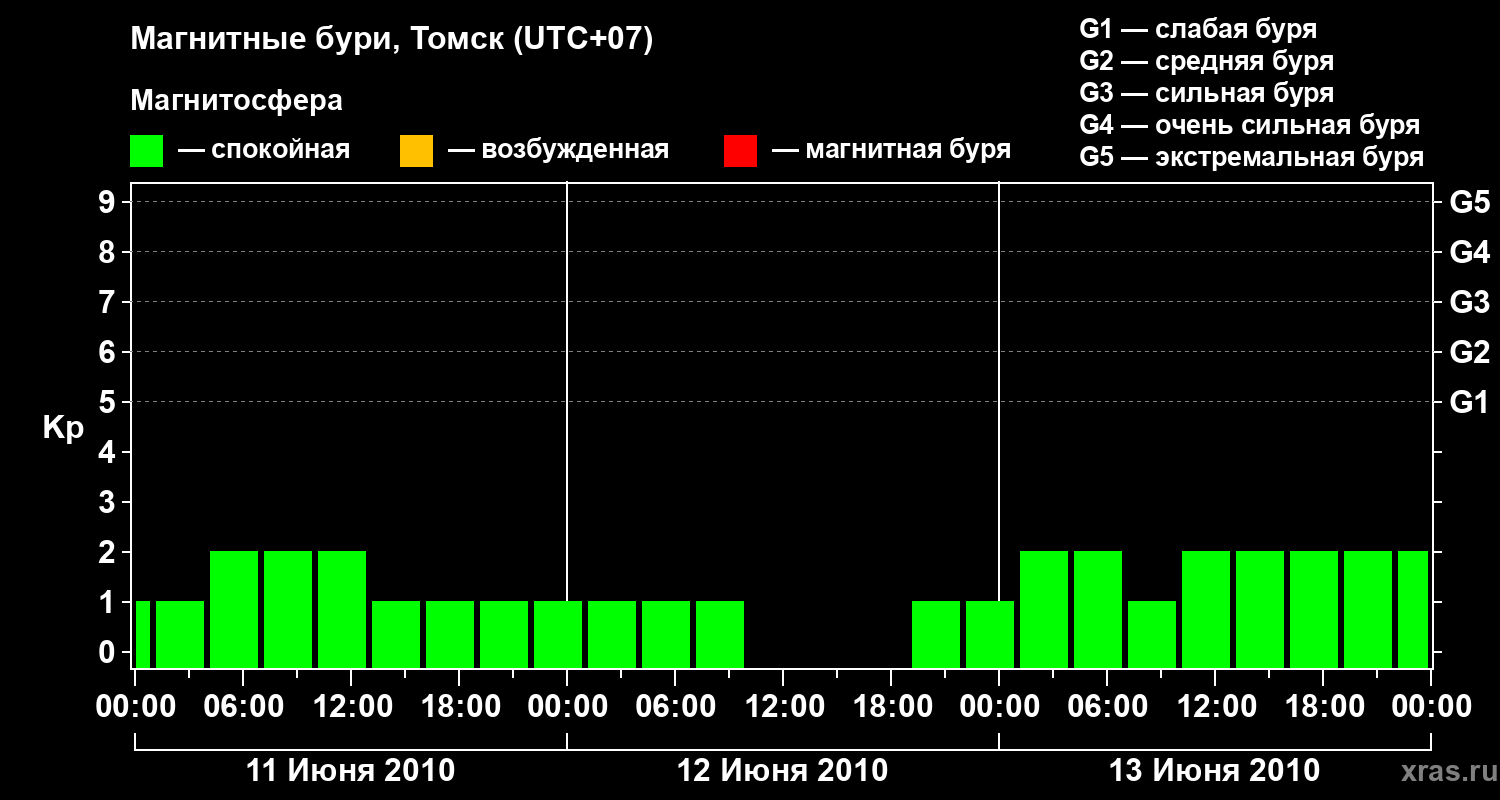 Изменения геомагнитного индекса Kp с 11 по 13 июня 2010 года для средних широт