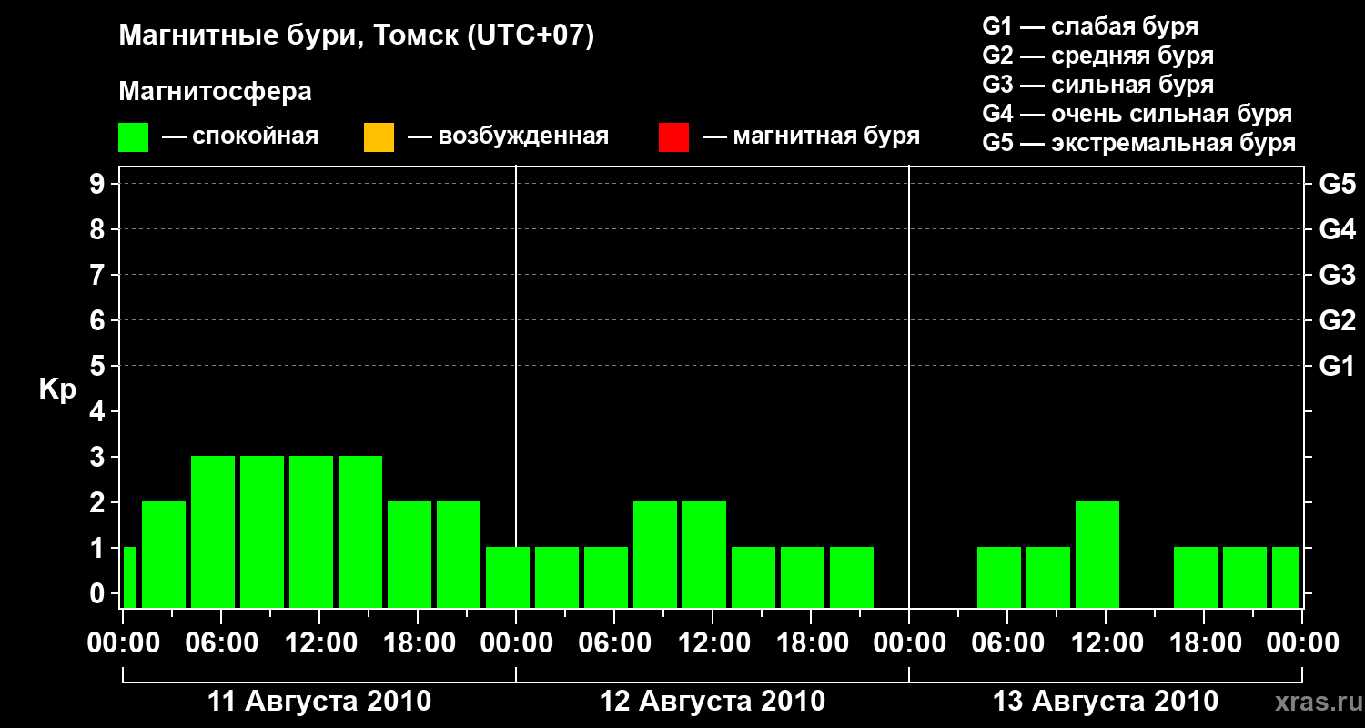 Изменения геомагнитного индекса Kp с 11 по 13 августа 2010 года для средних широт