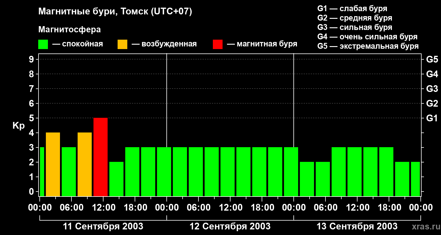 Изменения геомагнитного индекса Kp с 11 по 13 сентября 2003 года для средних широт