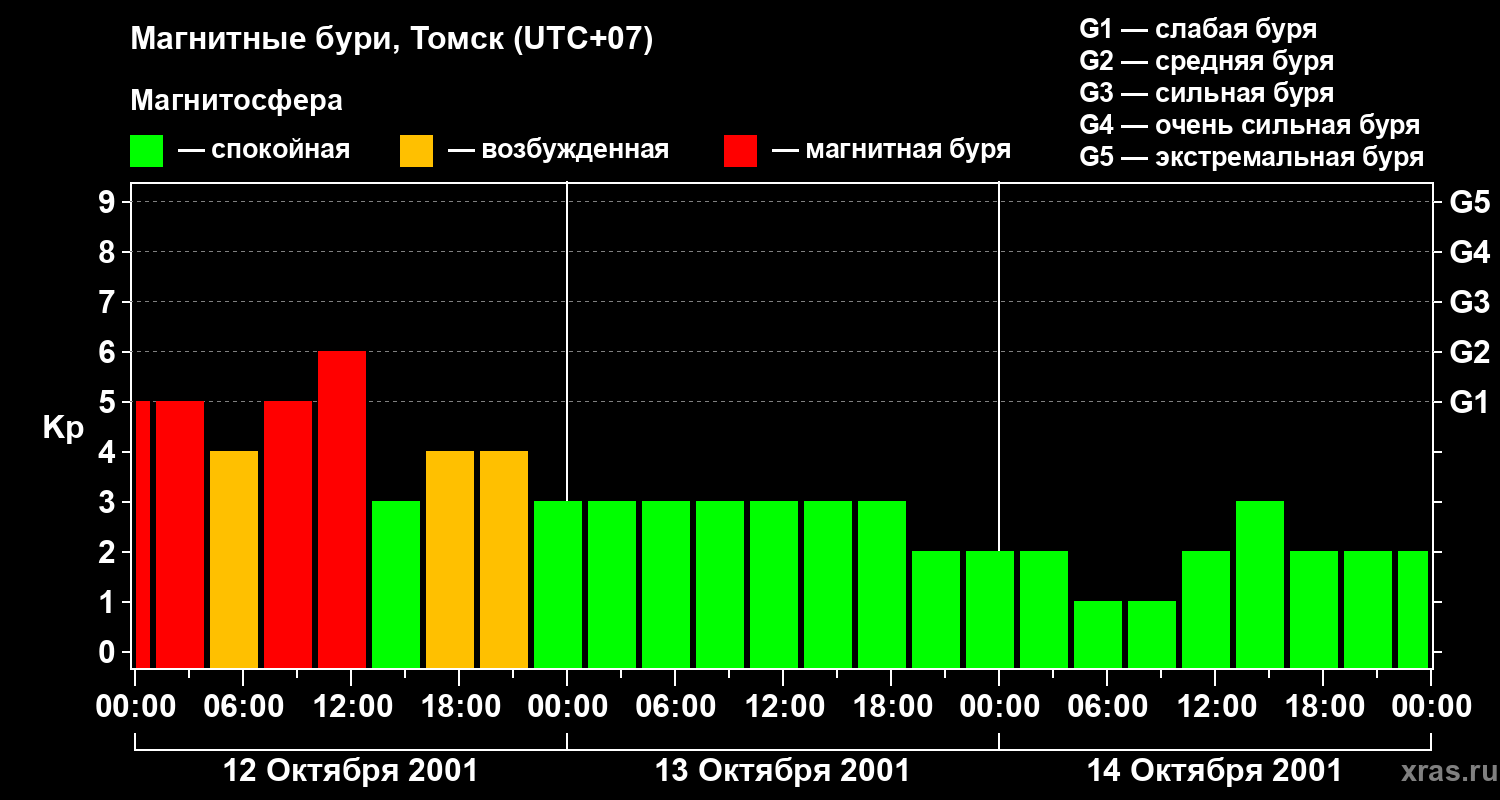 Изменения геомагнитного индекса Kp с 12 по 14 октября 2001 года для средних широт