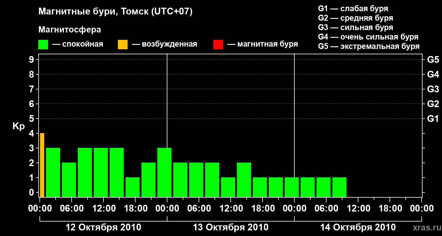 Изменения геомагнитного индекса Kp с 12 по 14 октября 2010 года для средних широт