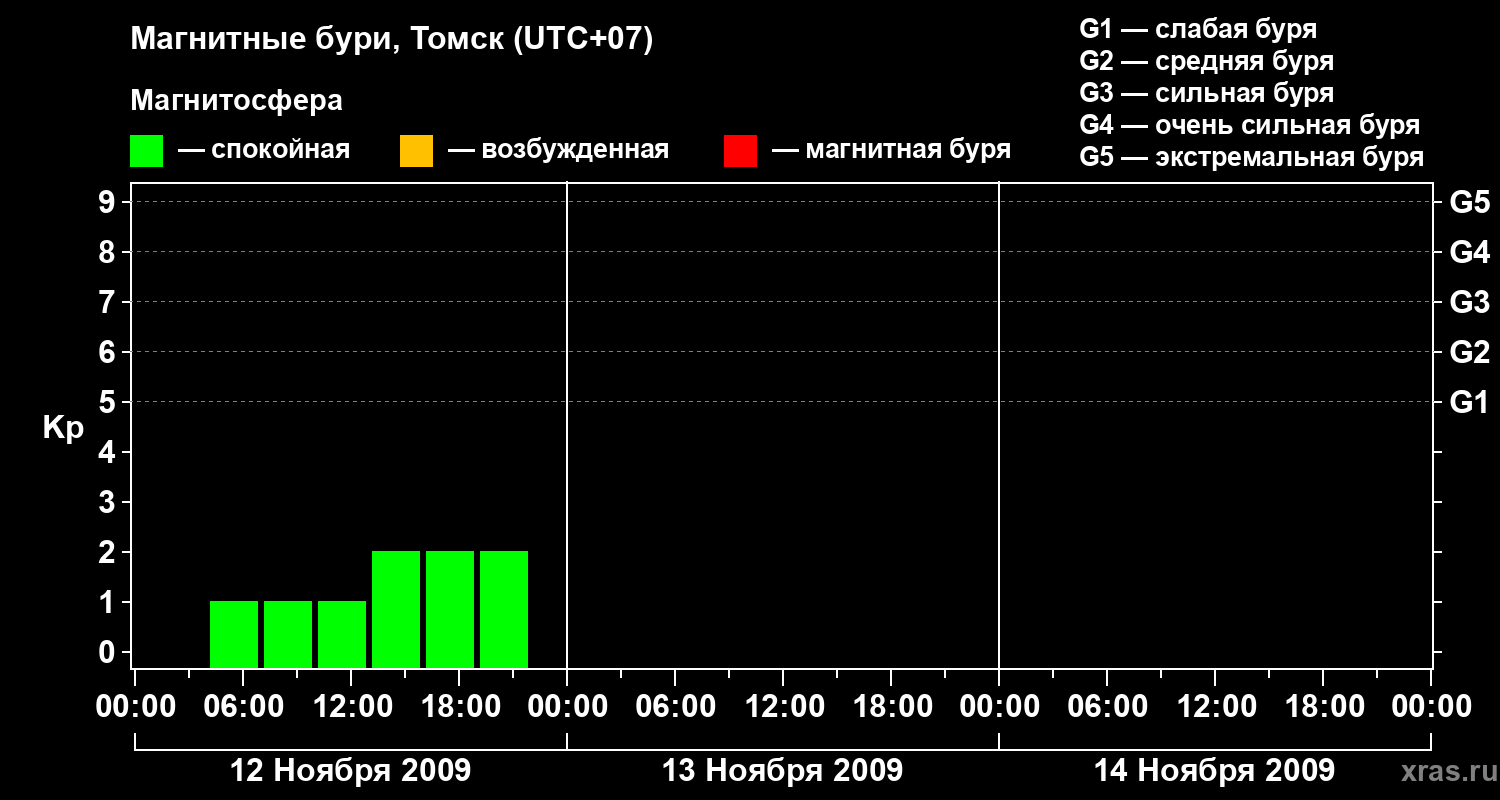 Изменения геомагнитного индекса Kp с 12 по 14 ноября 2009 года для средних широт