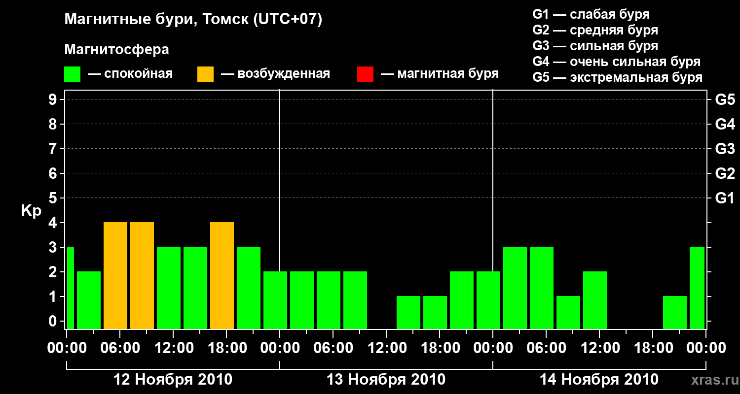 Изменения геомагнитного индекса Kp с 12 по 14 ноября 2010 года для средних широт