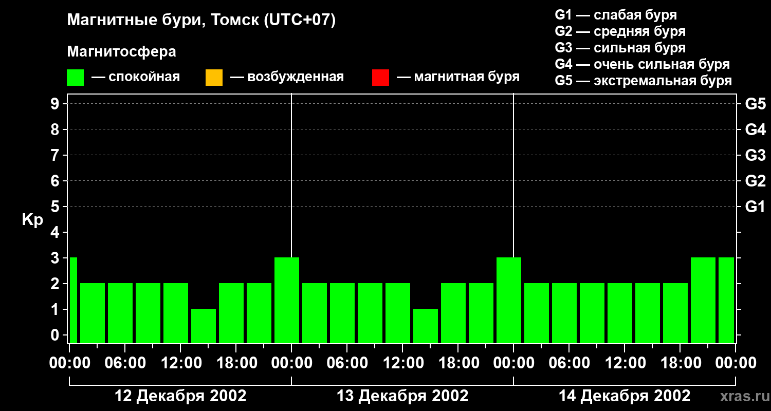 Изменения геомагнитного индекса Kp с 12 по 14 декабря 2002 года для средних широт