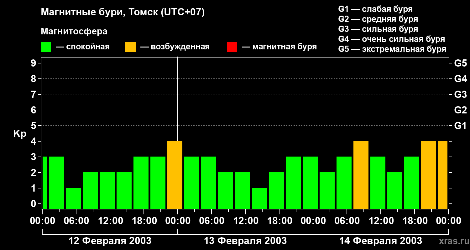 Изменения геомагнитного индекса Kp с 12 по 14 февраля 2003 года для средних широт