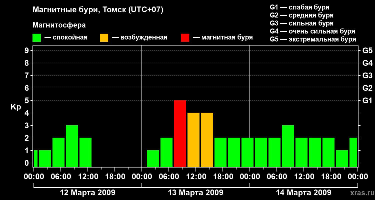 Изменения геомагнитного индекса Kp с 12 по 14 марта 2009 года для средних широт