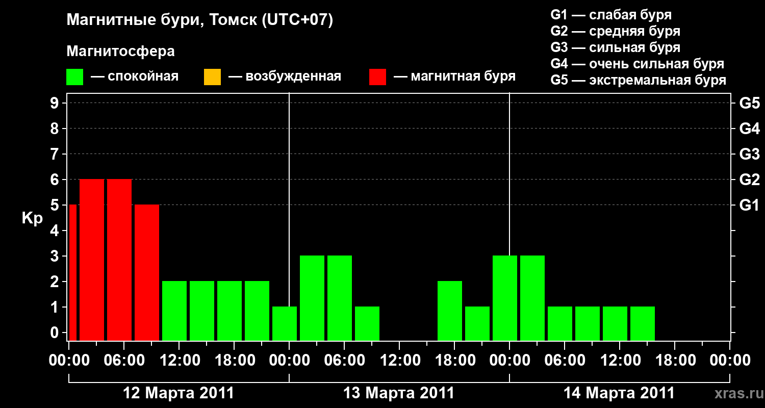 Изменения геомагнитного индекса Kp с 12 по 14 марта 2011 года для средних широт