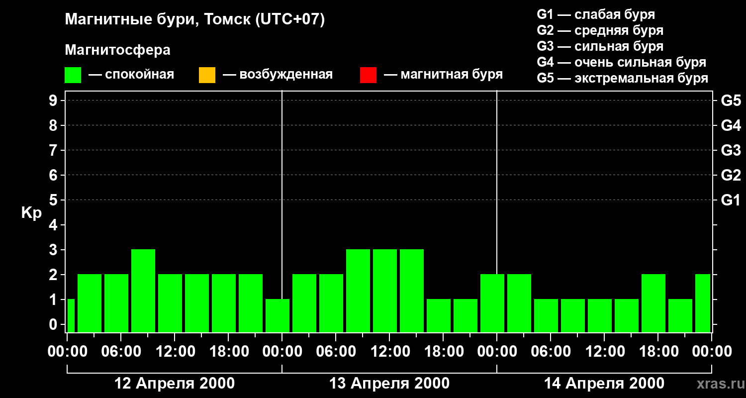 Изменения геомагнитного индекса Kp с 12 по 14 апреля 2000 года для средних широт
