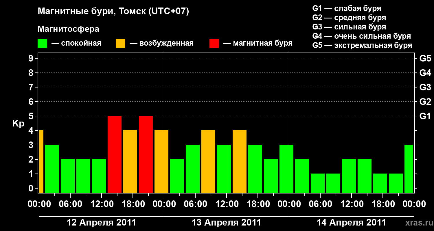 Изменения геомагнитного индекса Kp с 12 по 14 апреля 2011 года для средних широт