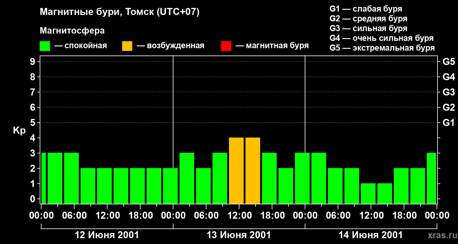 Изменения геомагнитного индекса Kp с 12 по 14 июня 2001 года для средних широт