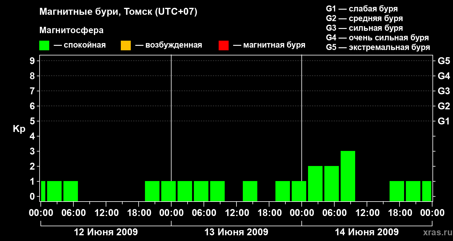 Изменения геомагнитного индекса Kp с 12 по 14 июня 2009 года для средних широт