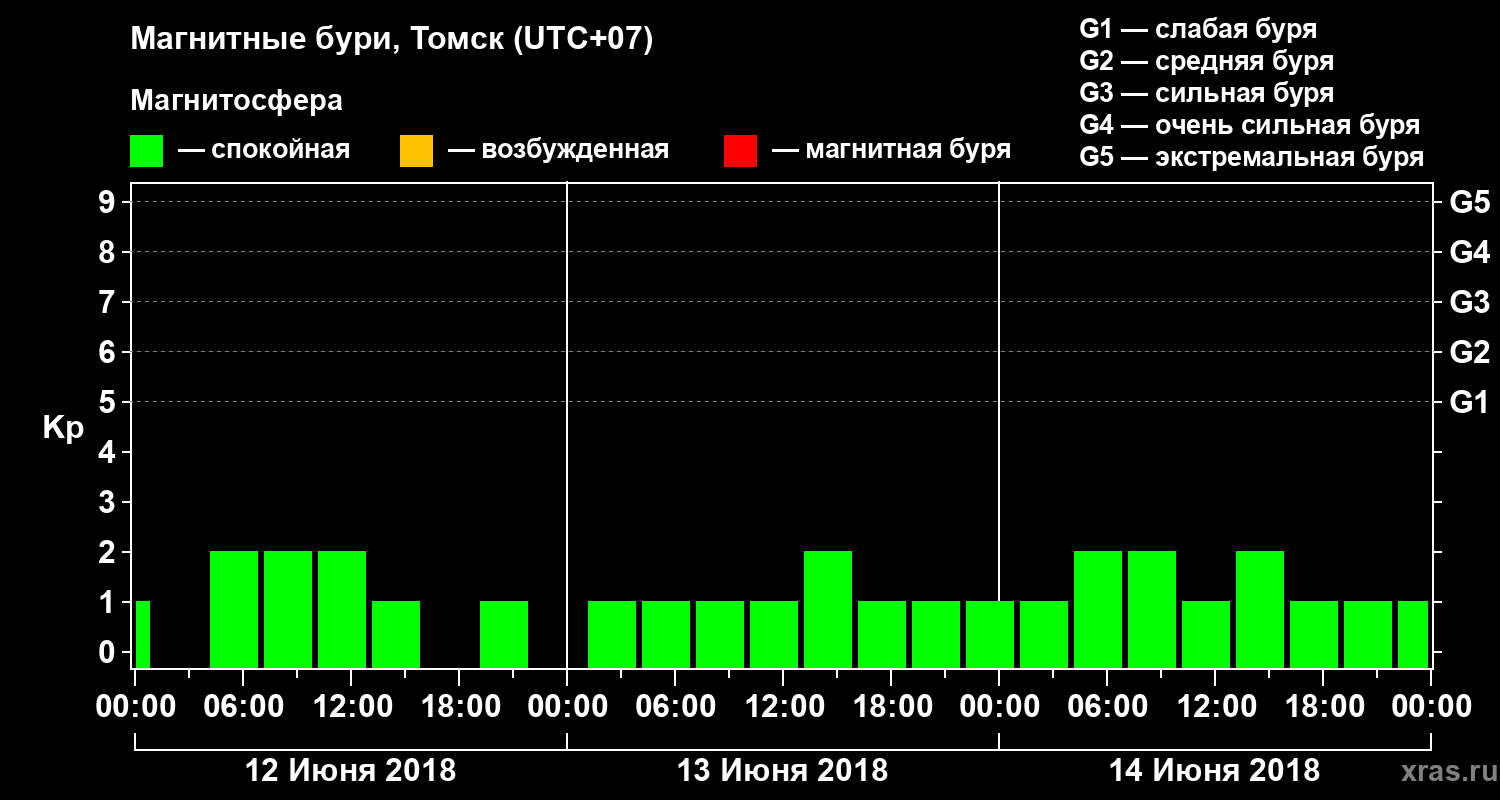 Изменения геомагнитного индекса Kp с 12 по 14 июня 2018 года для средних широт