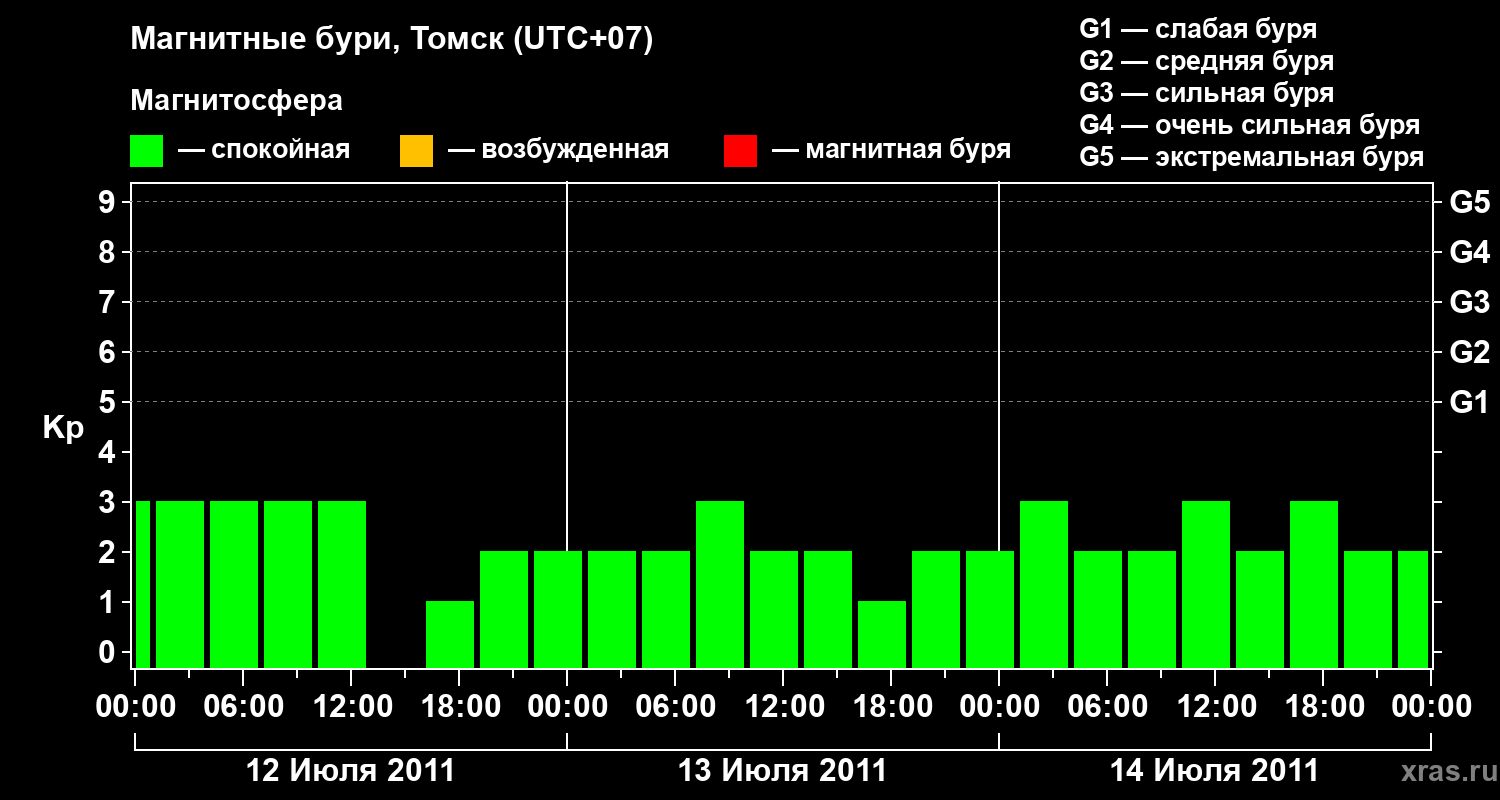 Изменения геомагнитного индекса Kp с 12 по 14 июля 2011 года для средних широт