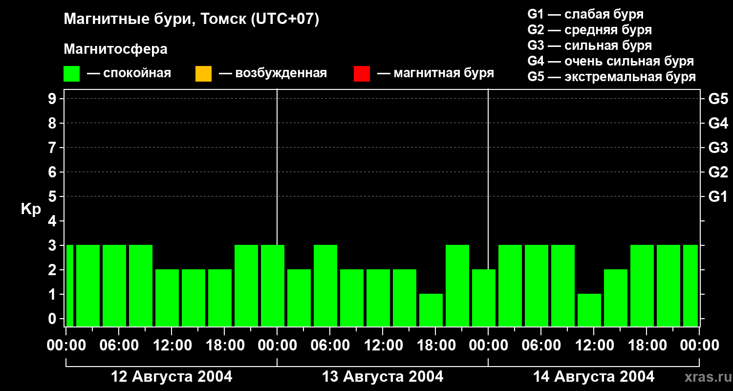 Изменения геомагнитного индекса Kp с 12 по 14 августа 2004 года для средних широт