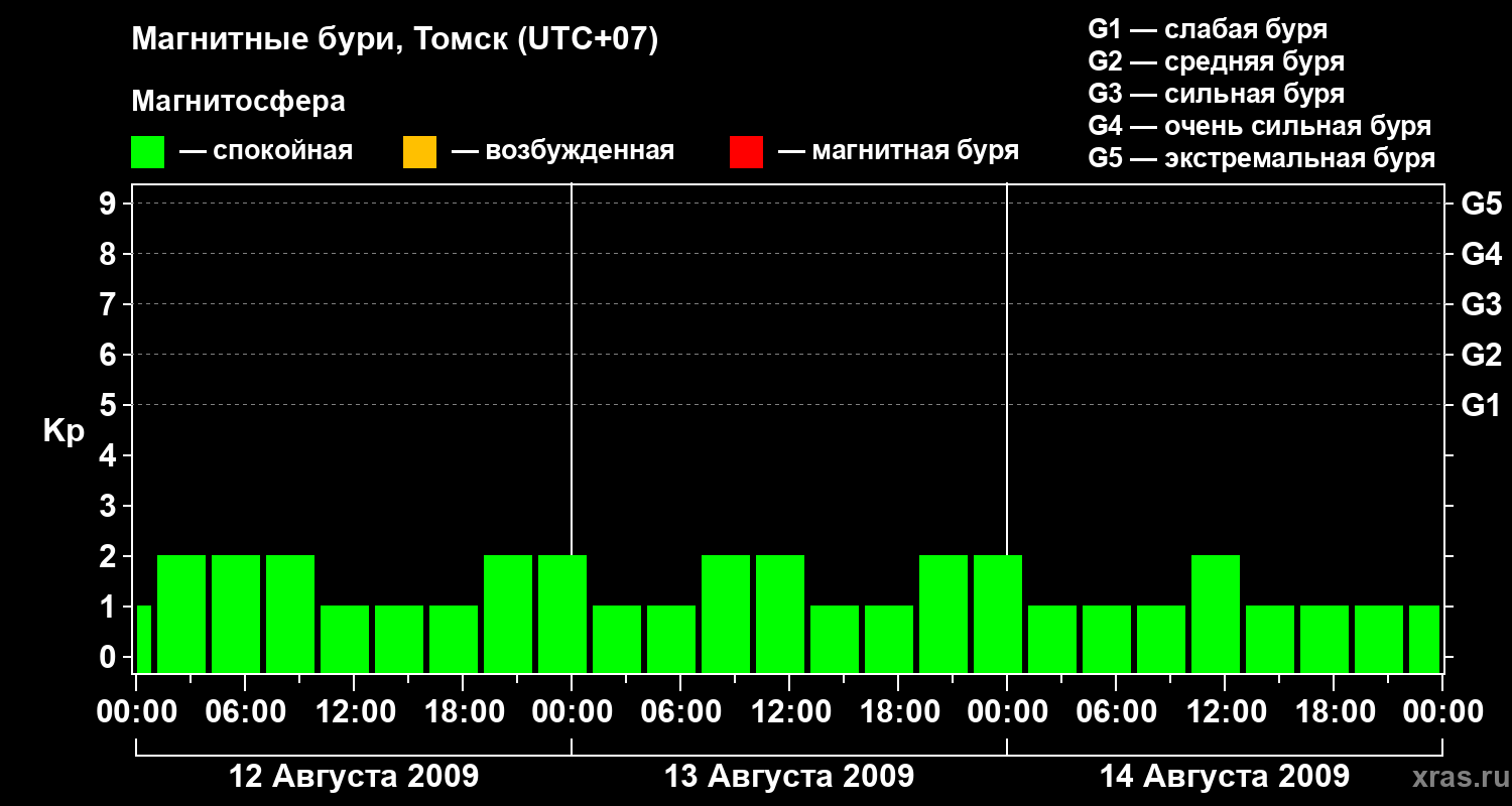 Изменения геомагнитного индекса Kp с 12 по 14 августа 2009 года для средних широт