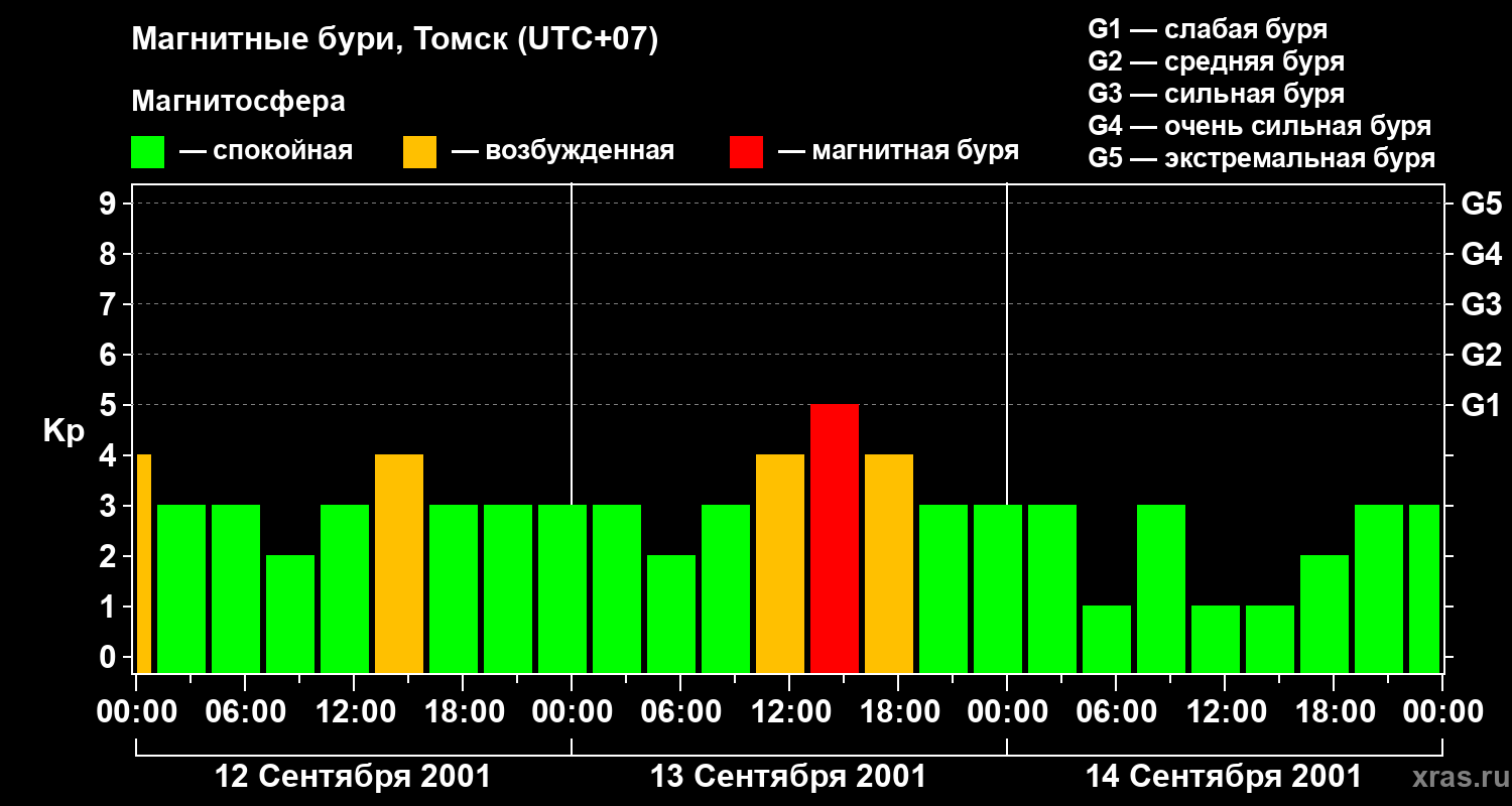Изменения геомагнитного индекса Kp с 12 по 14 сентября 2001 года для средних широт