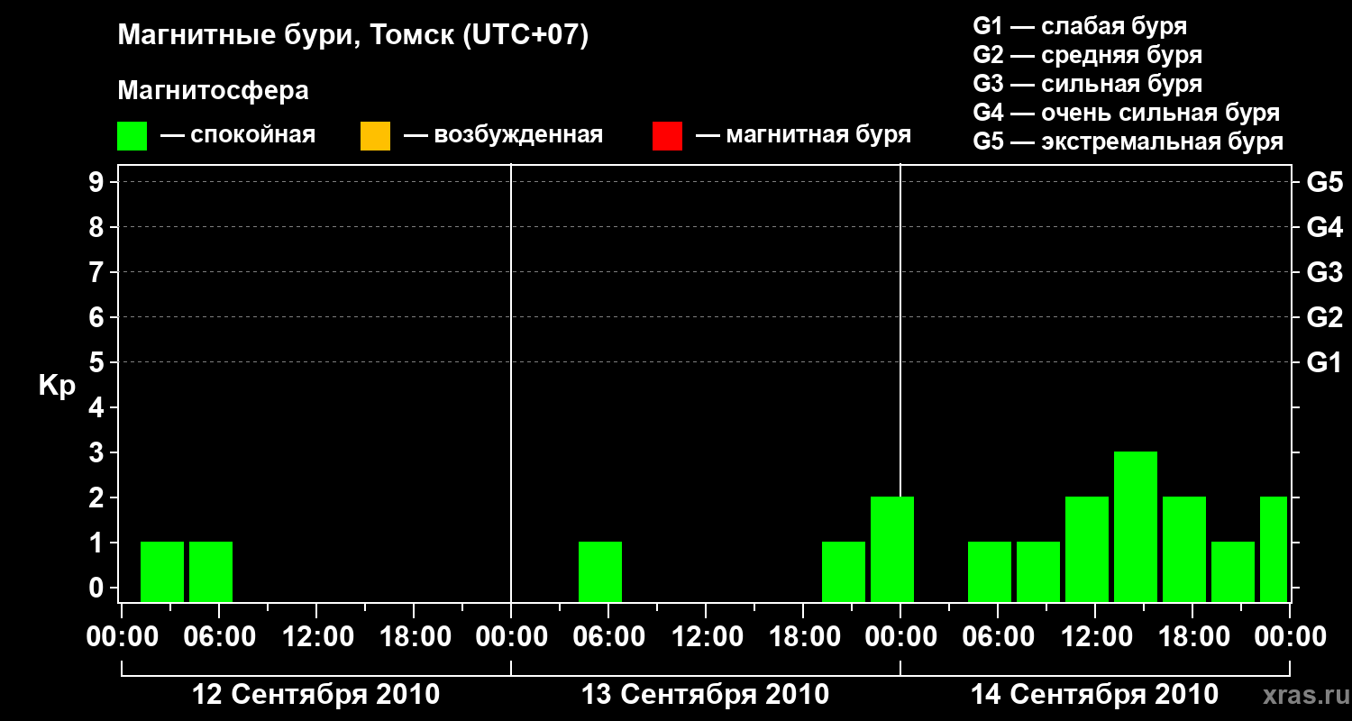Изменения геомагнитного индекса Kp с 12 по 14 сентября 2010 года для средних широт