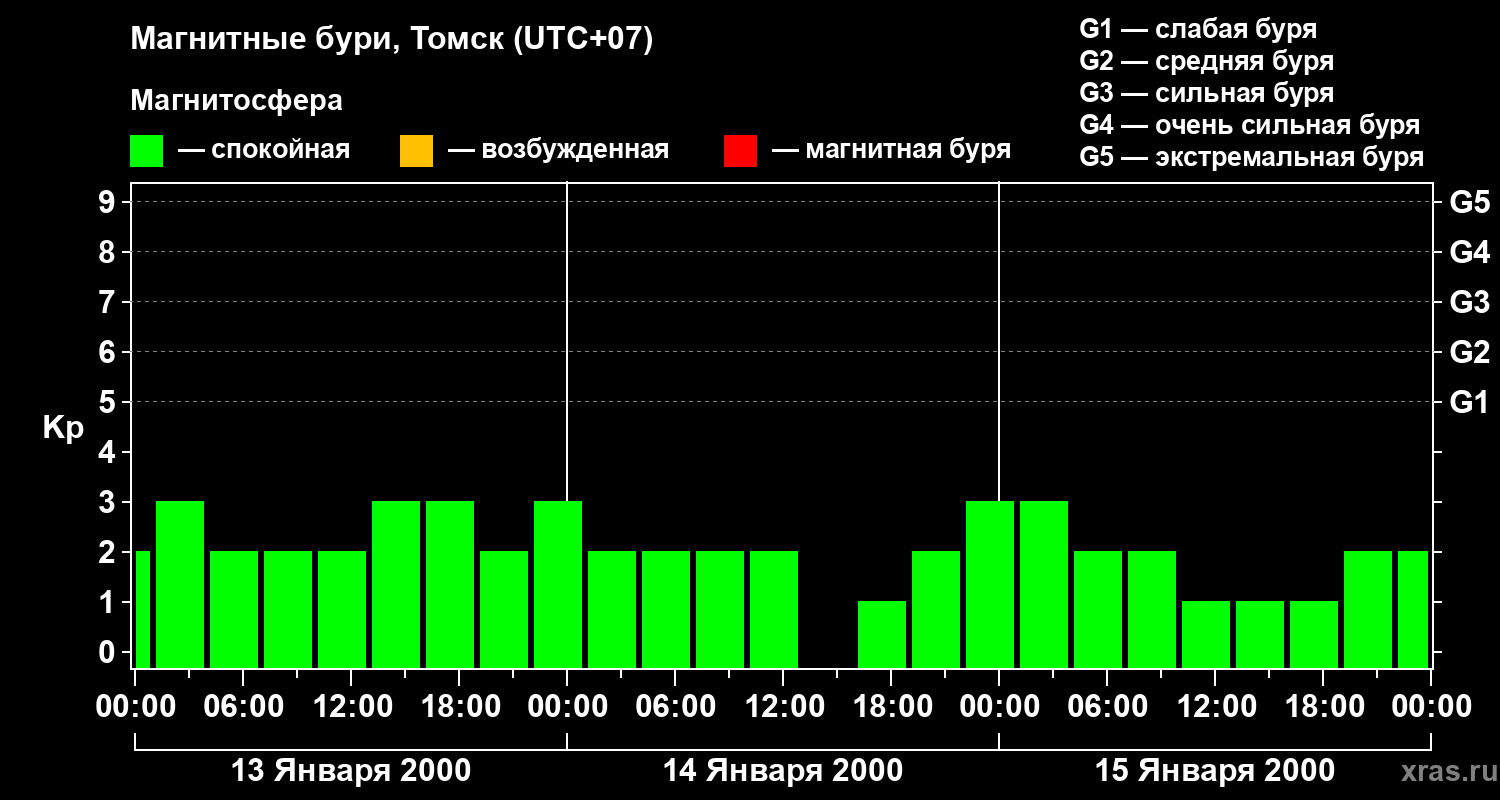Изменения геомагнитного индекса Kp с 13 по 15 января 2000 года для средних широт