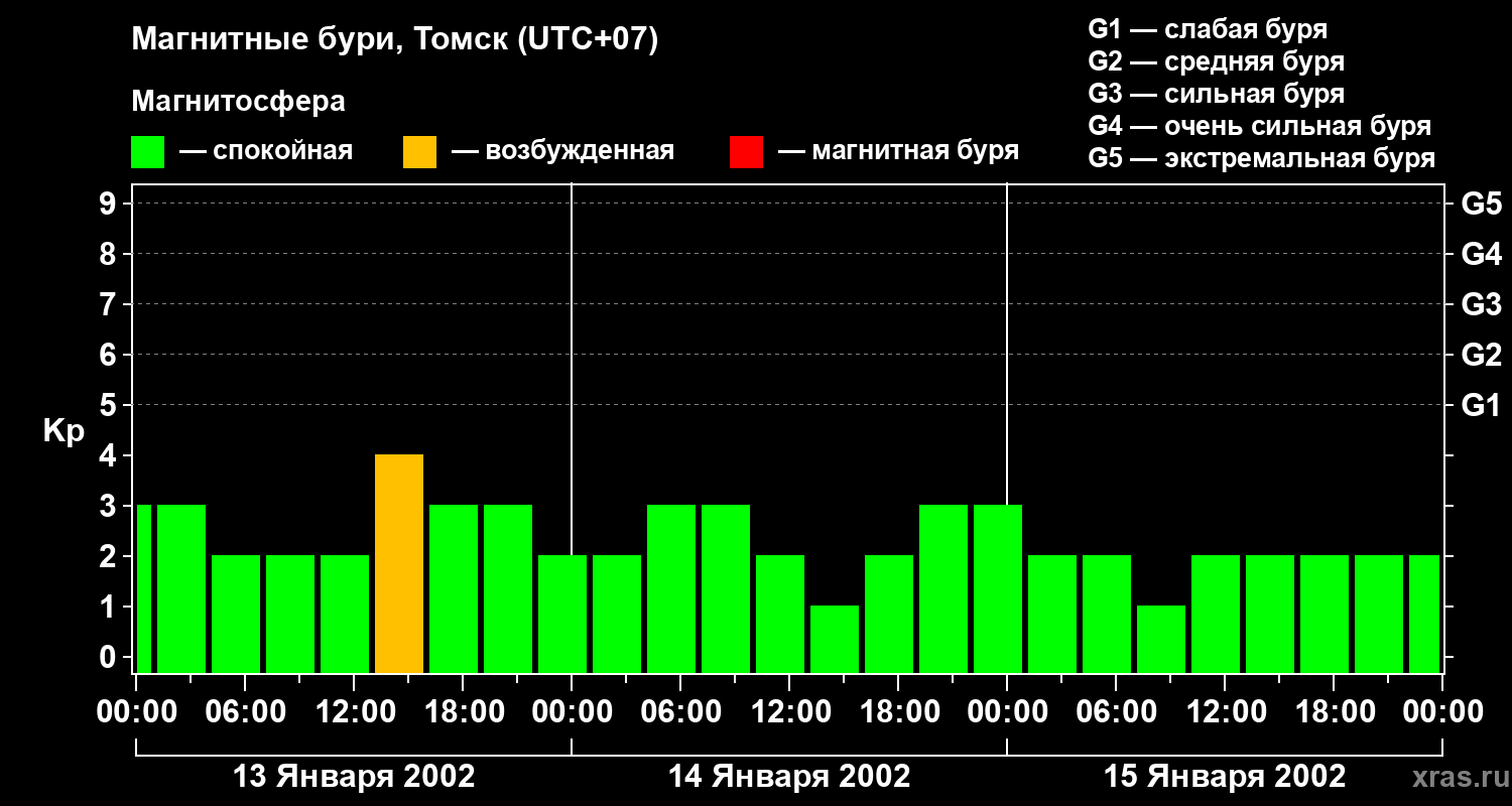 Изменения геомагнитного индекса Kp с 13 по 15 января 2002 года для средних широт