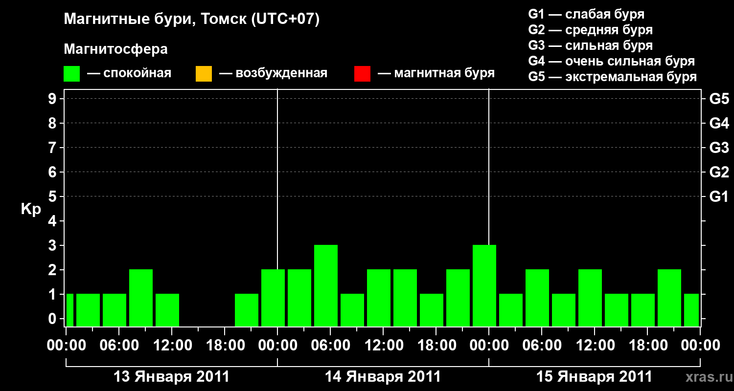 Изменения геомагнитного индекса Kp с 13 по 15 января 2011 года для средних широт