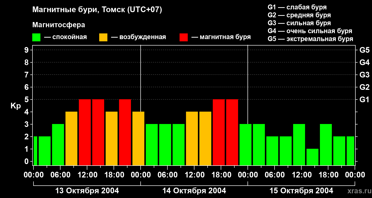 Изменения геомагнитного индекса Kp с 13 по 15 октября 2004 года для средних широт