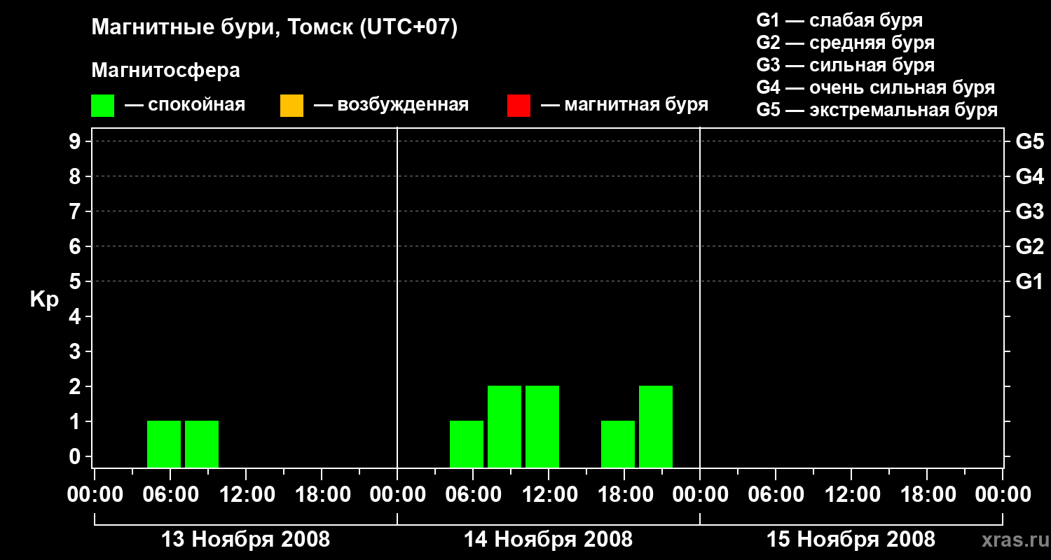 Изменения геомагнитного индекса Kp с 13 по 15 ноября 2008 года для средних широт