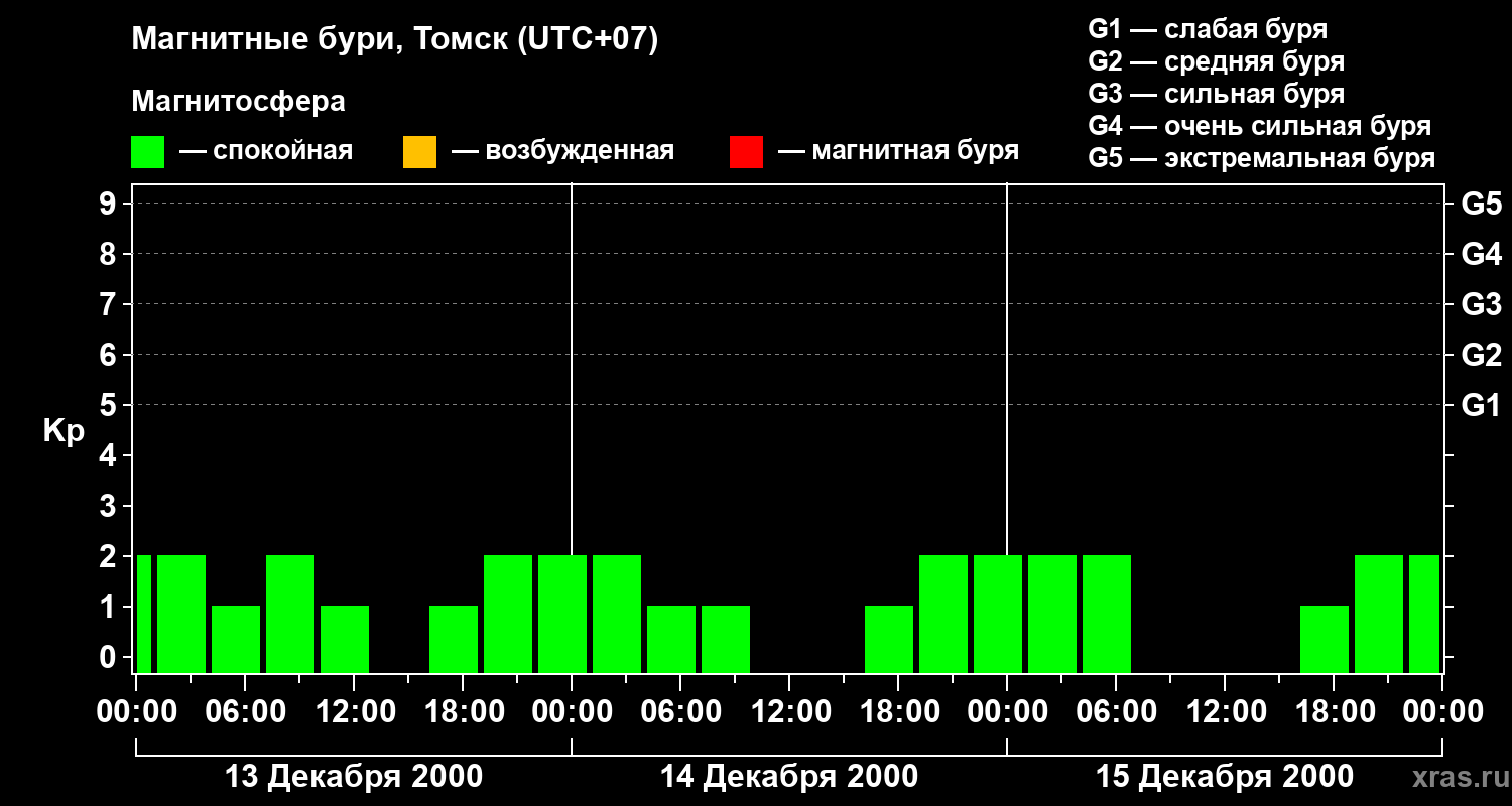 Изменения геомагнитного индекса Kp с 13 по 15 декабря 2000 года для средних широт