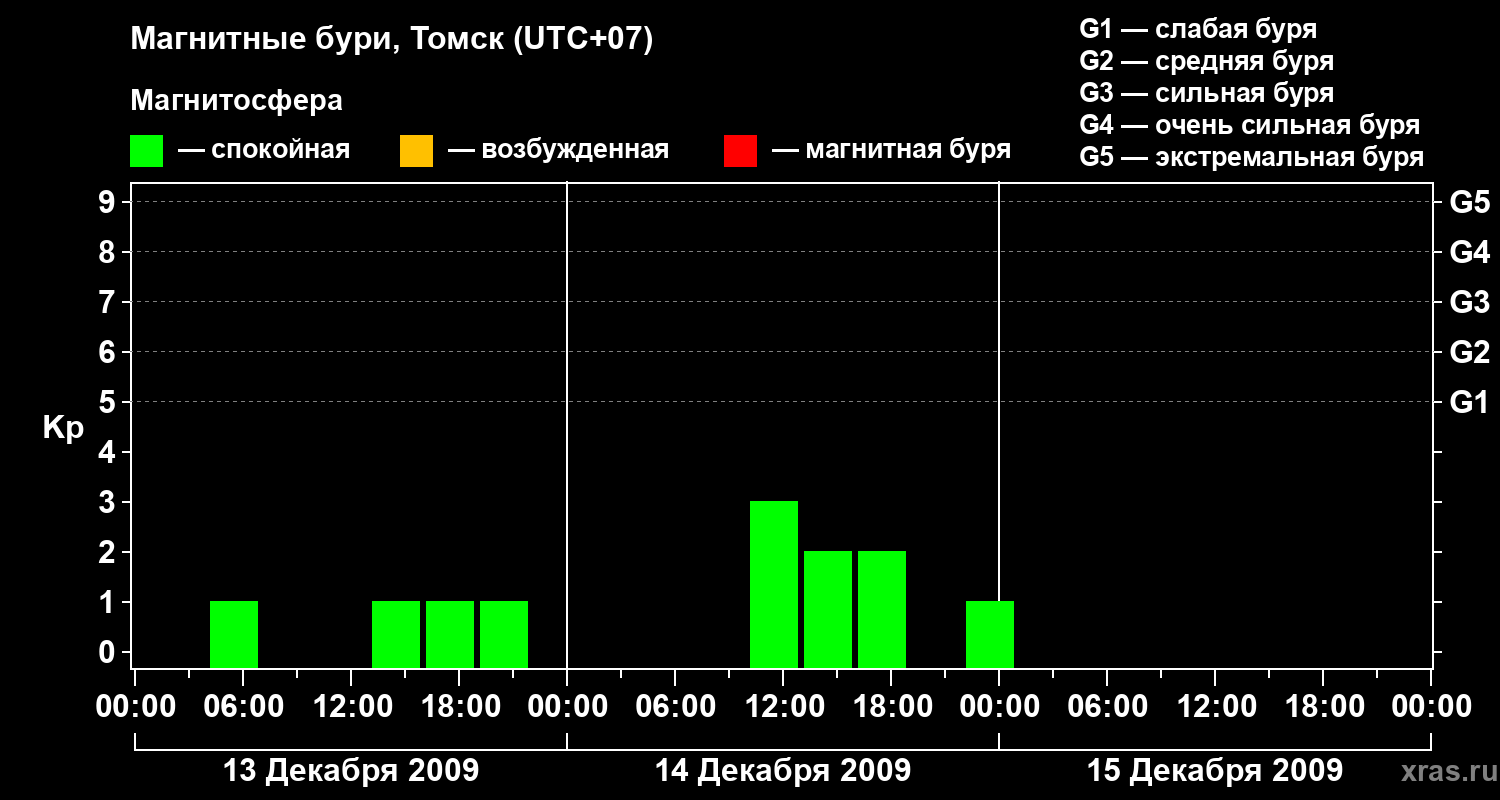 Изменения геомагнитного индекса Kp с 13 по 15 декабря 2009 года для средних широт