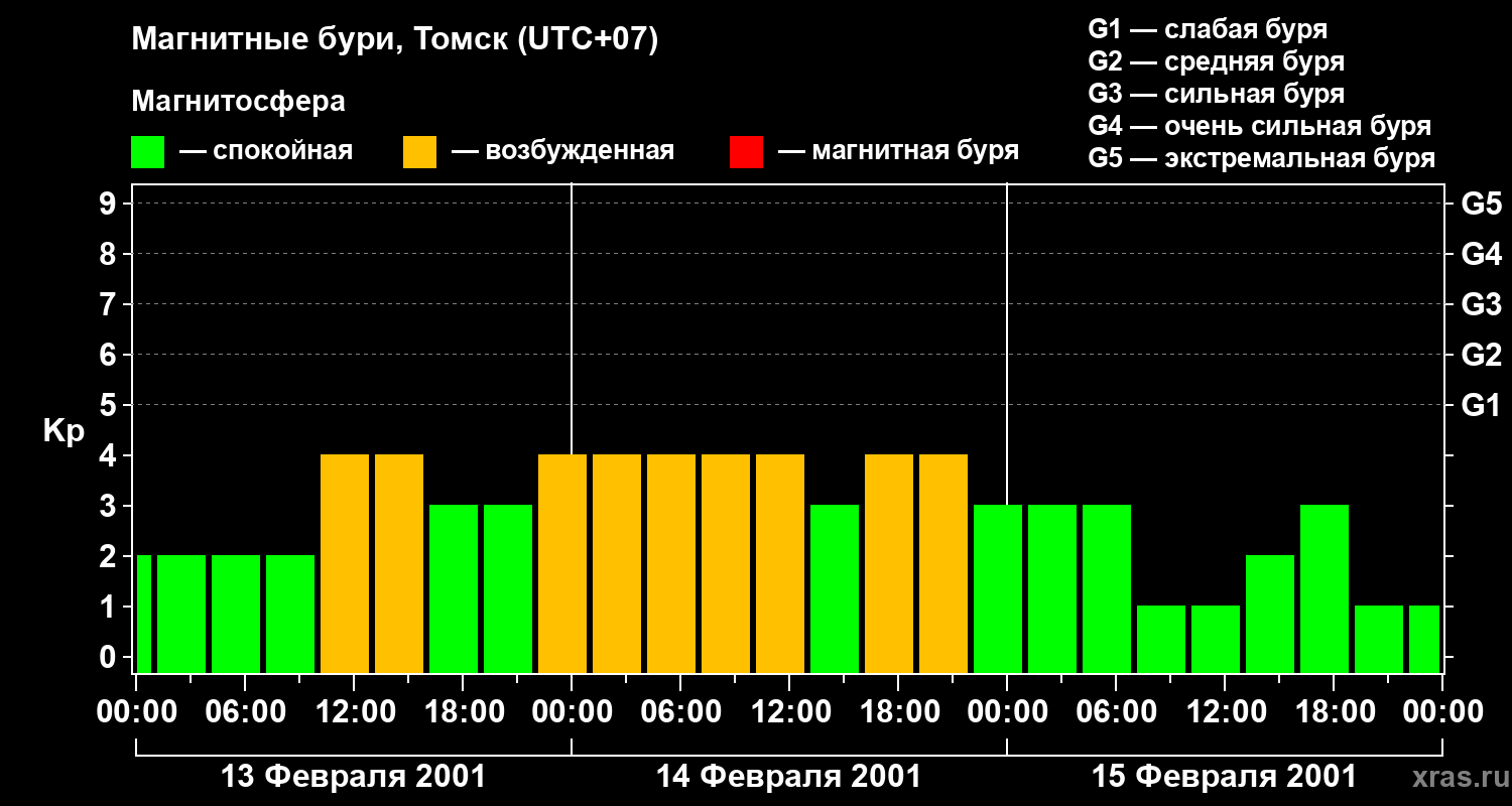 Изменения геомагнитного индекса Kp с 13 по 15 февраля 2001 года для средних широт