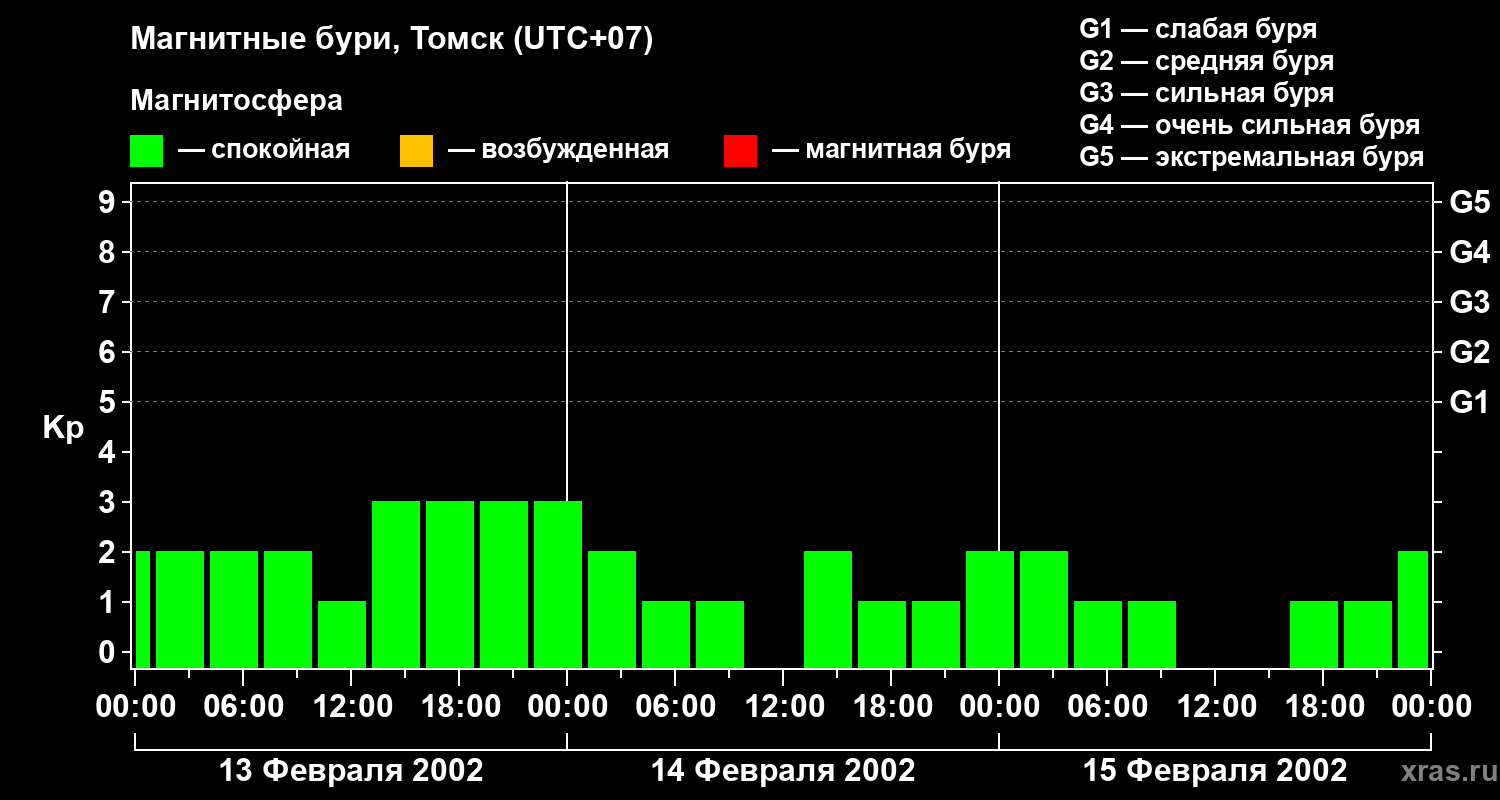 Изменения геомагнитного индекса Kp с 13 по 15 февраля 2002 года для средних широт