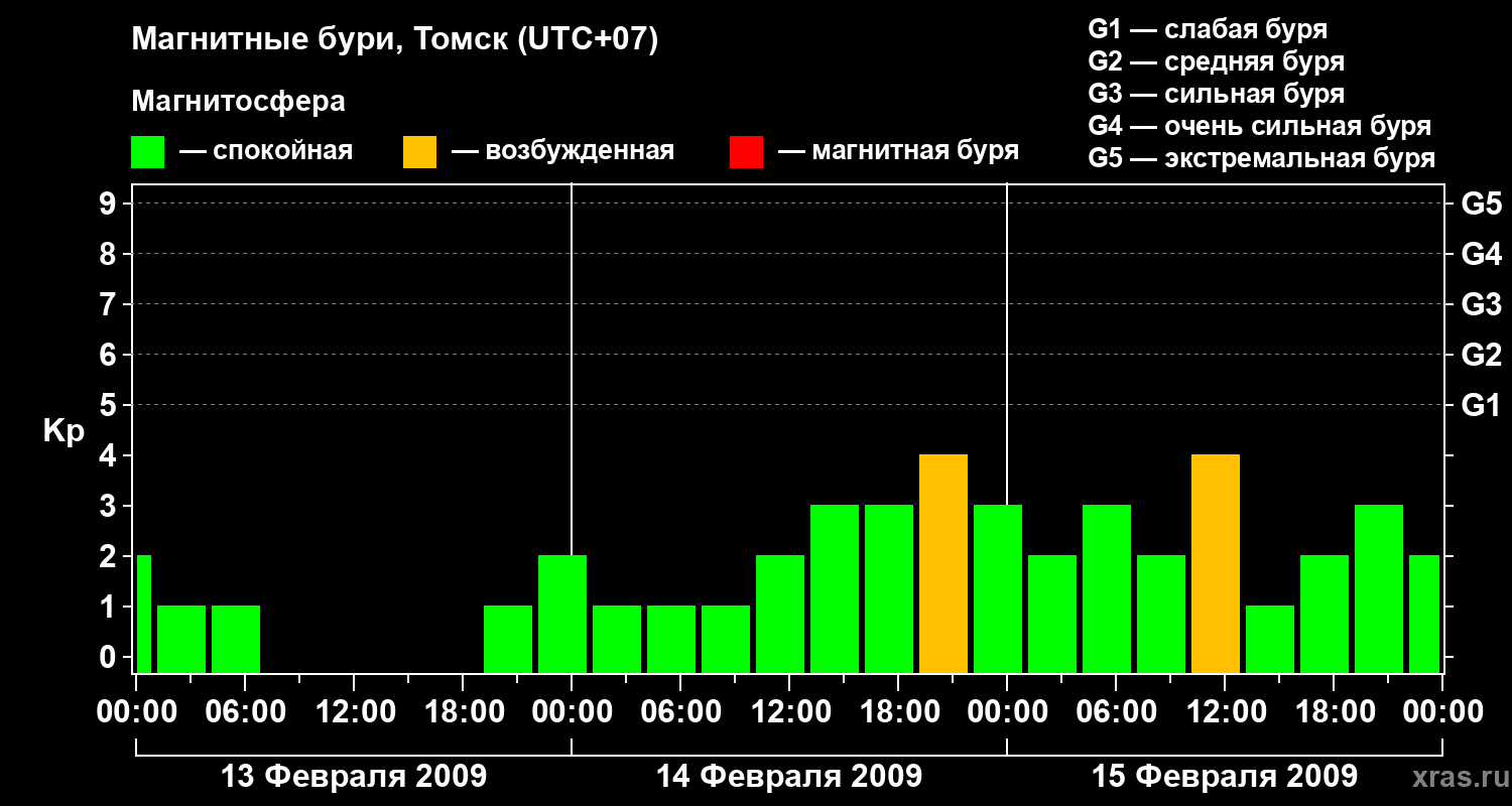 Изменения геомагнитного индекса Kp с 13 по 15 февраля 2009 года для средних широт
