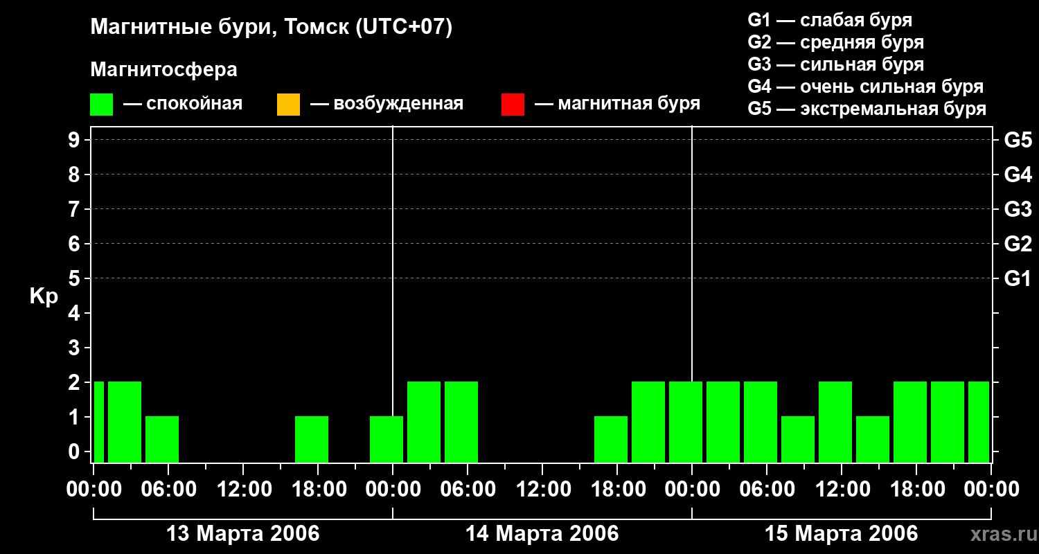 Изменения геомагнитного индекса Kp с 13 по 15 марта 2006 года для средних широт