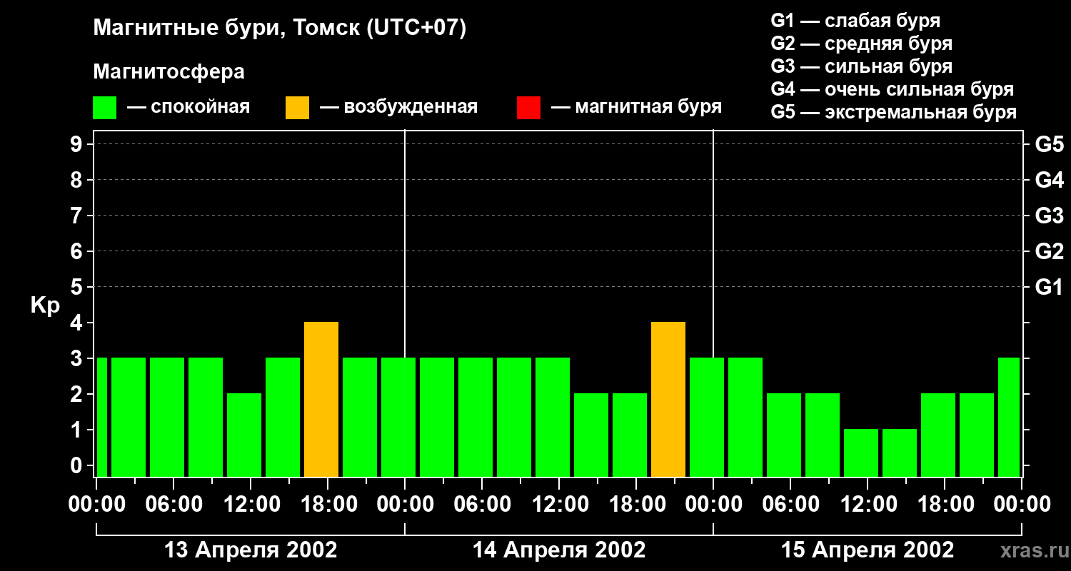 Изменения геомагнитного индекса Kp с 13 по 15 апреля 2002 года для средних широт
