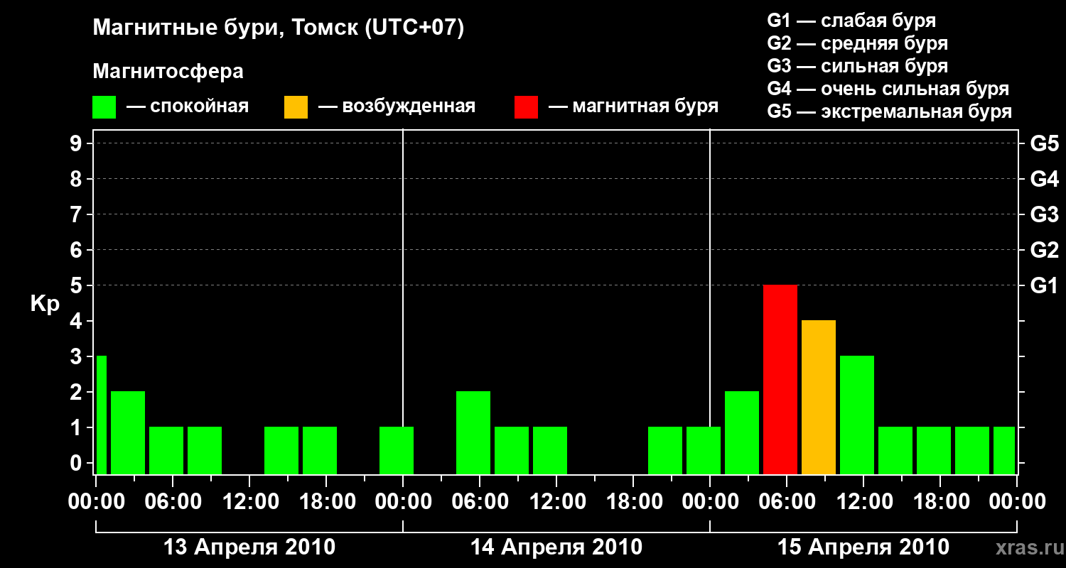 Изменения геомагнитного индекса Kp с 13 по 15 апреля 2010 года для средних широт