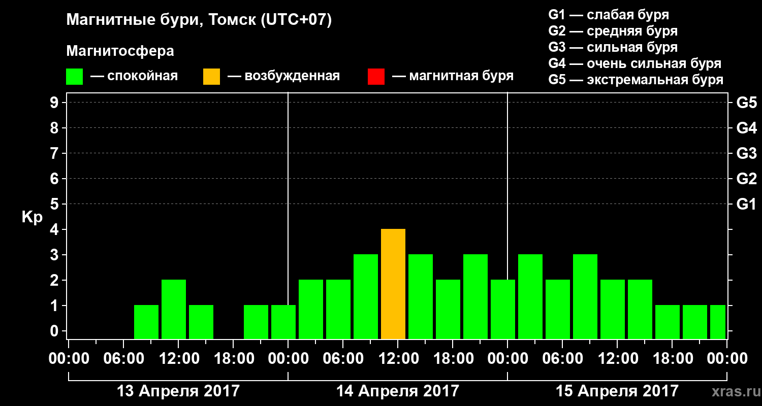 Изменения геомагнитного индекса Kp с 13 по 15 апреля 2017 года для средних широт