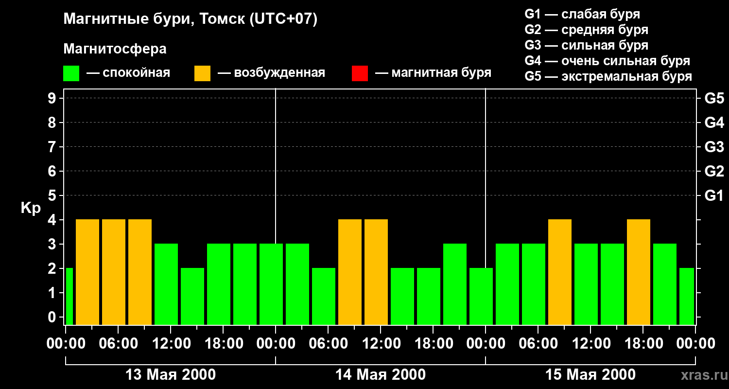 Изменения геомагнитного индекса Kp с 13 по 15 мая 2000 года для средних широт