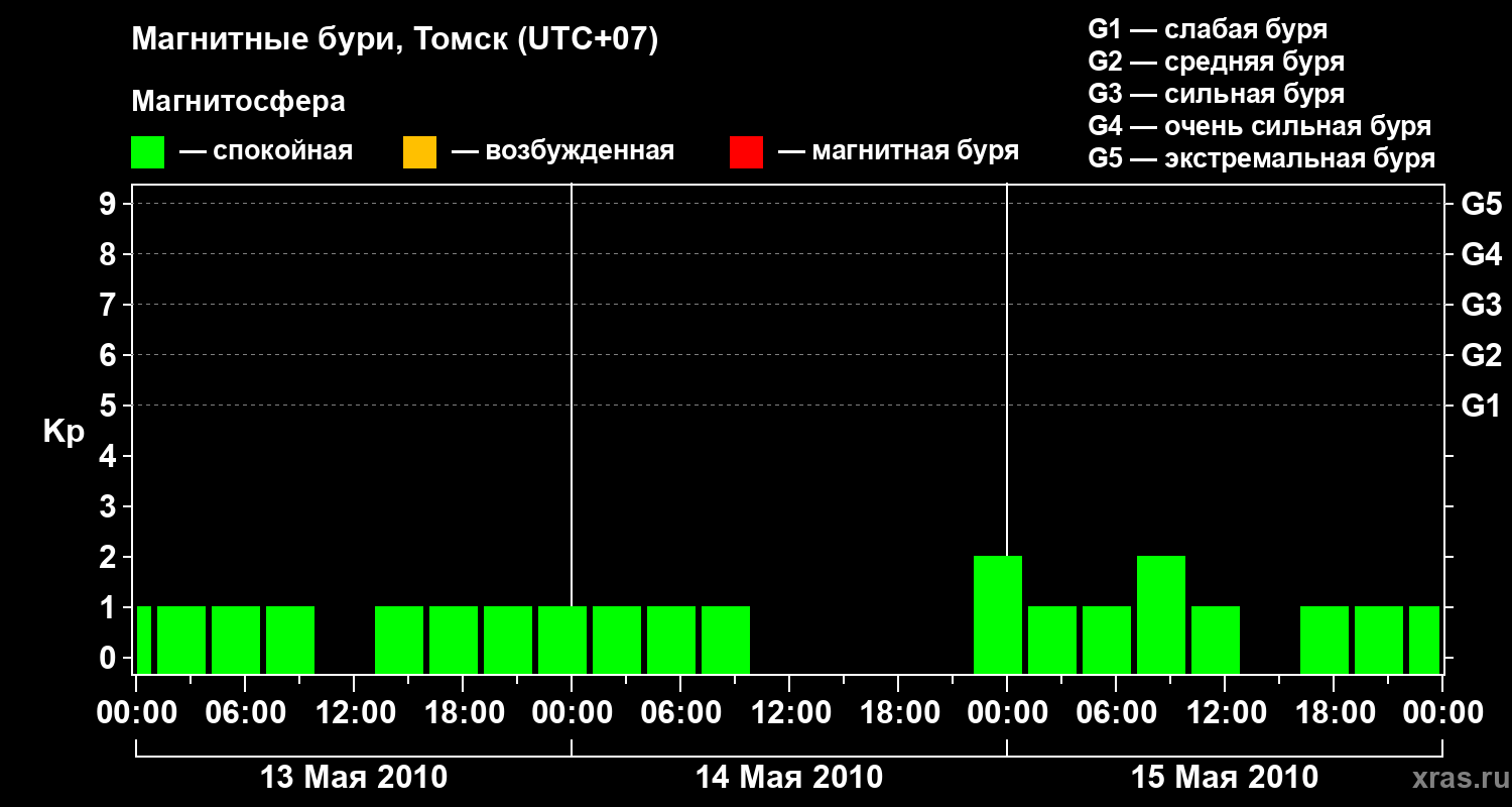 Изменения геомагнитного индекса Kp с 13 по 15 мая 2010 года для средних широт