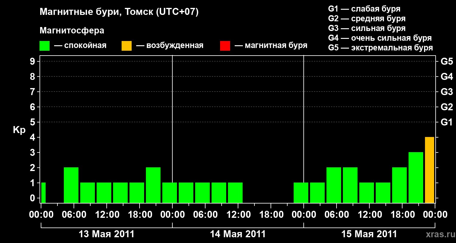 Изменения геомагнитного индекса Kp с 13 по 15 мая 2011 года для средних широт