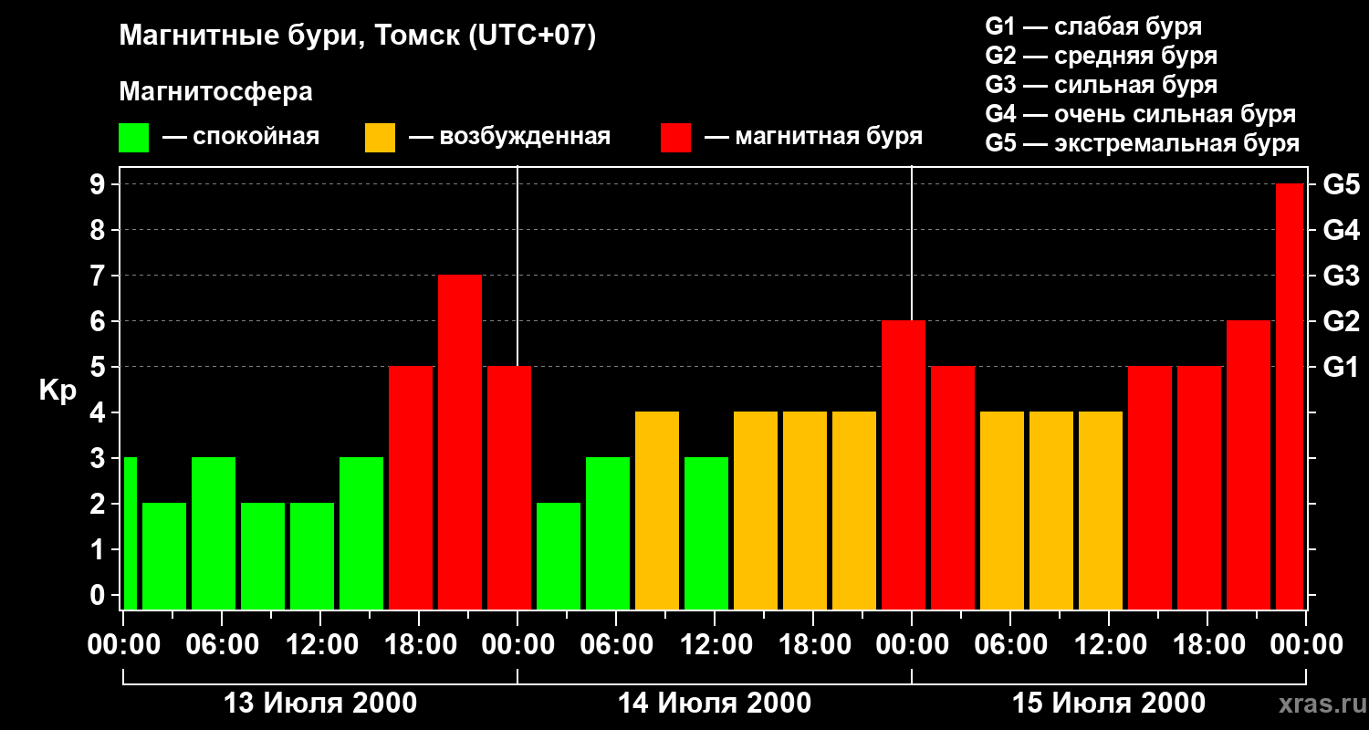 Изменения геомагнитного индекса Kp с 13 по 15 июля 2000 года для средних широт