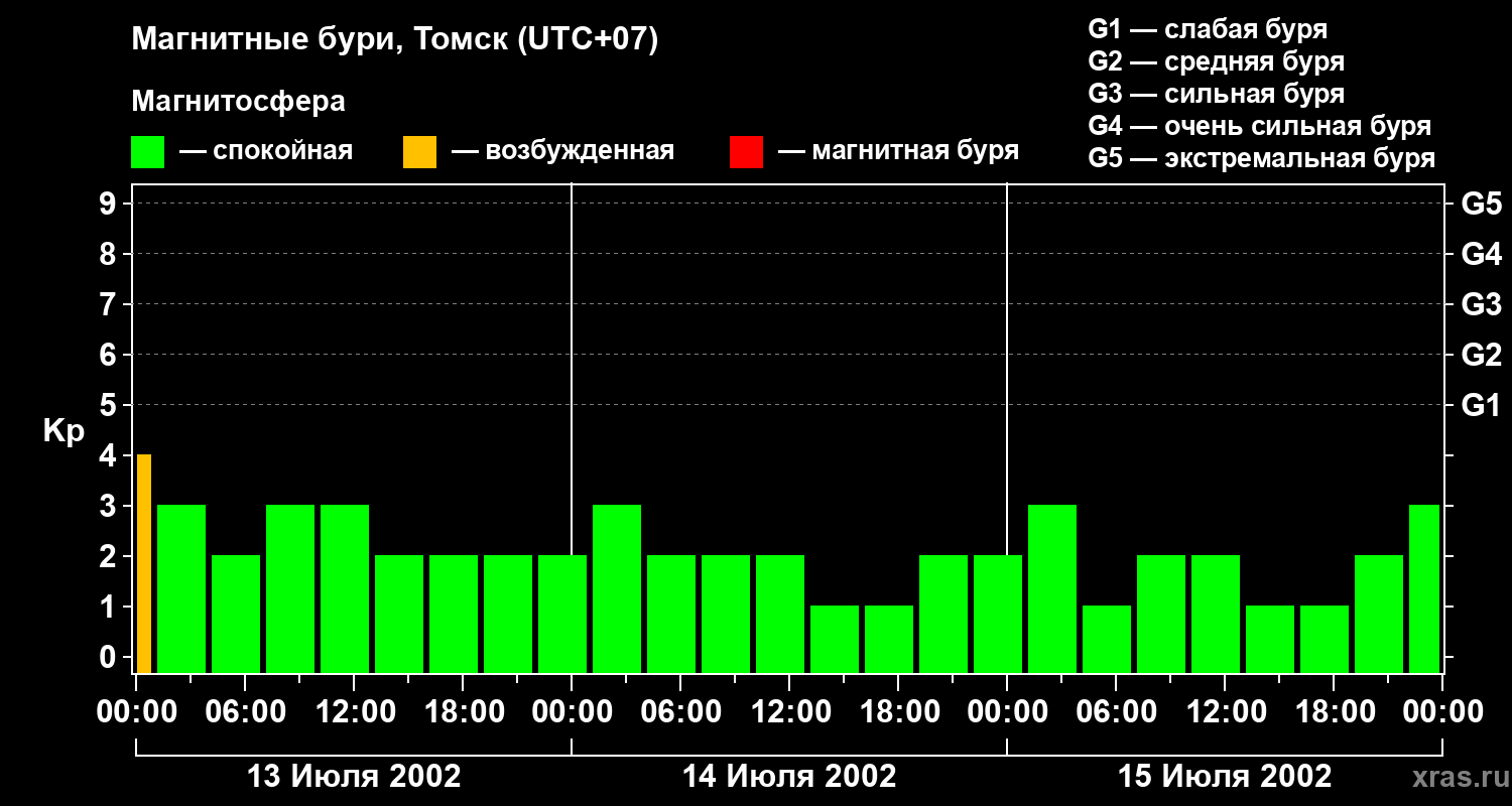 Изменения геомагнитного индекса Kp с 13 по 15 июля 2002 года для средних широт