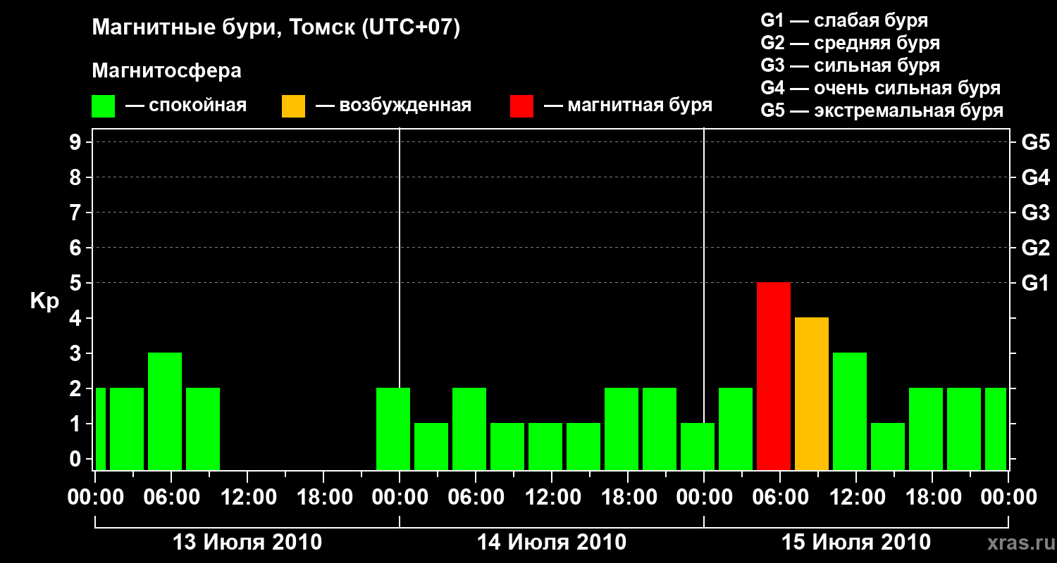 Изменения геомагнитного индекса Kp с 13 по 15 июля 2010 года для средних широт