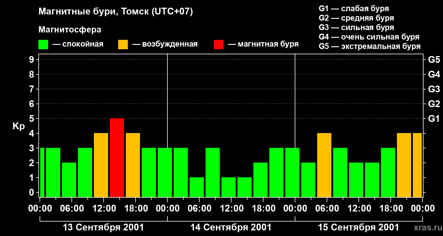 Изменения геомагнитного индекса Kp с 13 по 15 сентября 2001 года для средних широт