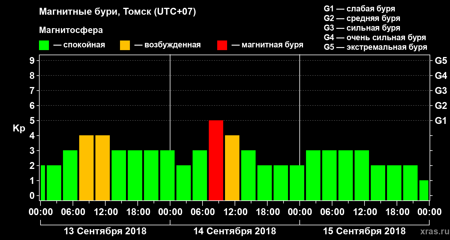 Изменения геомагнитного индекса Kp с 13 по 15 сентября 2018 года для средних широт