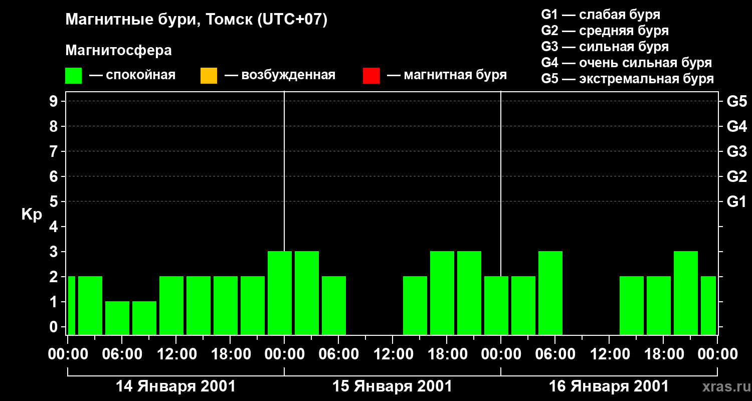 Изменения геомагнитного индекса Kp с 14 по 16 января 2001 года для средних широт