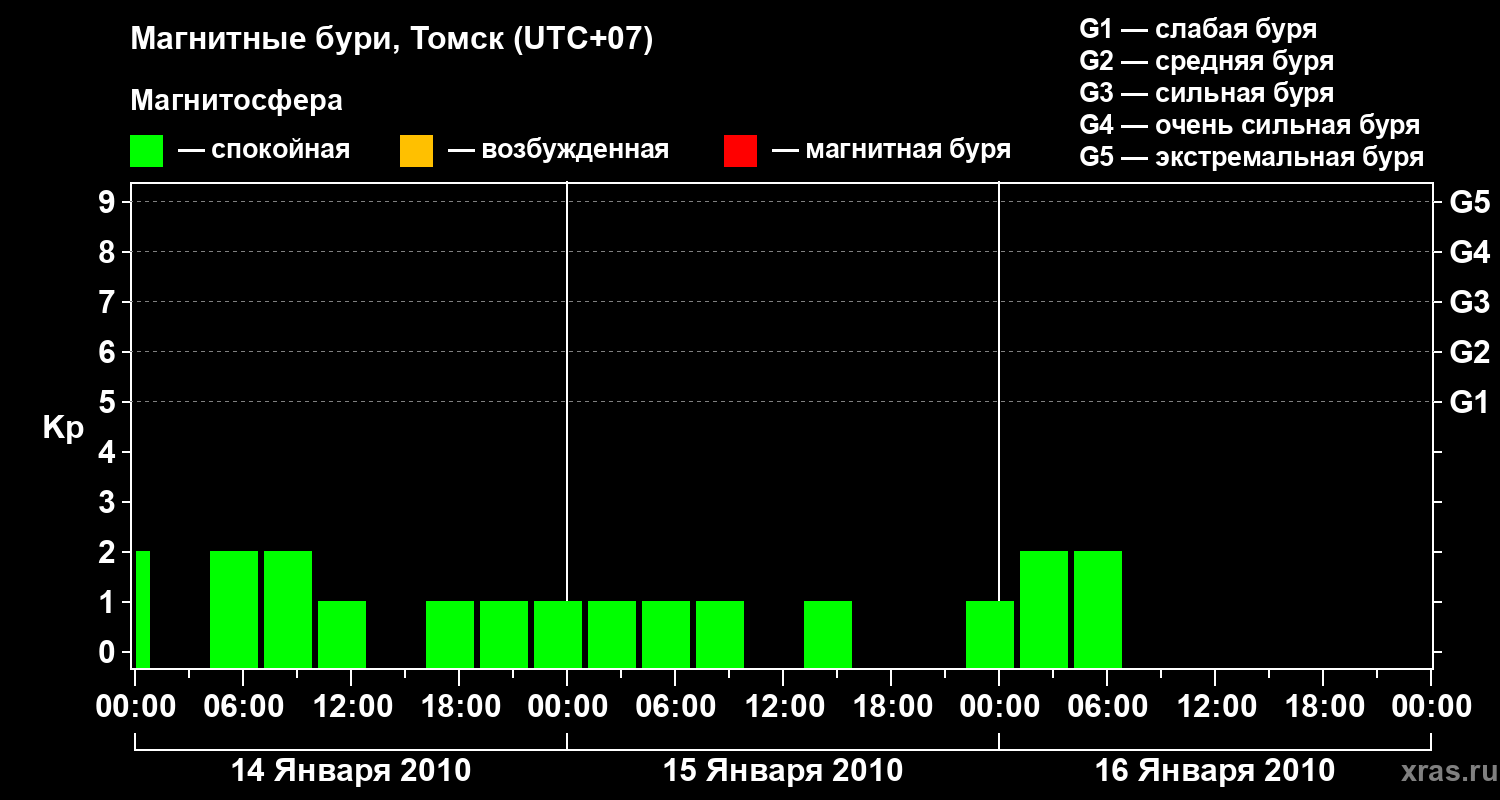 Изменения геомагнитного индекса Kp с 14 по 16 января 2010 года для средних широт