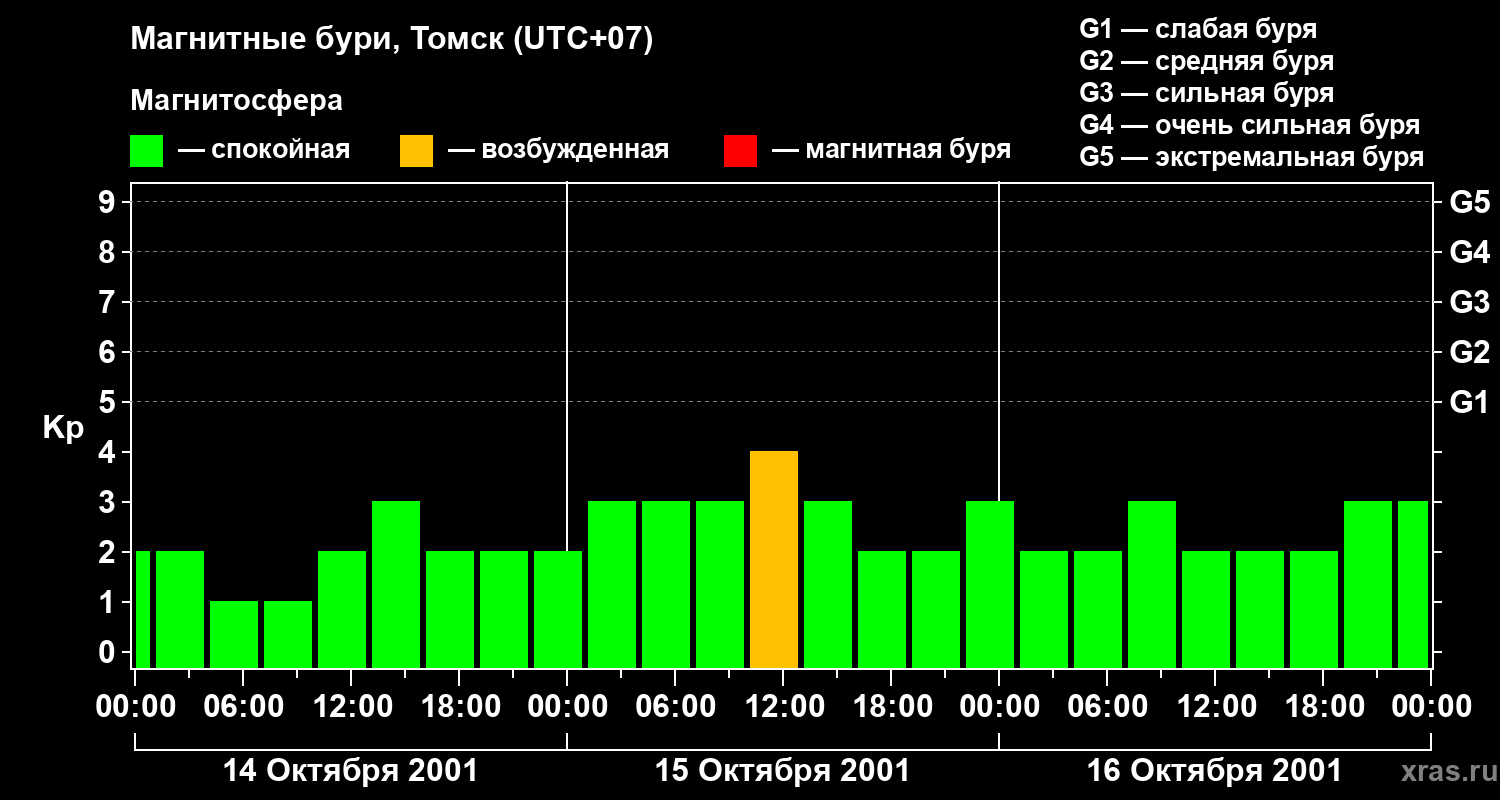 Изменения геомагнитного индекса Kp с 14 по 16 октября 2001 года для средних широт