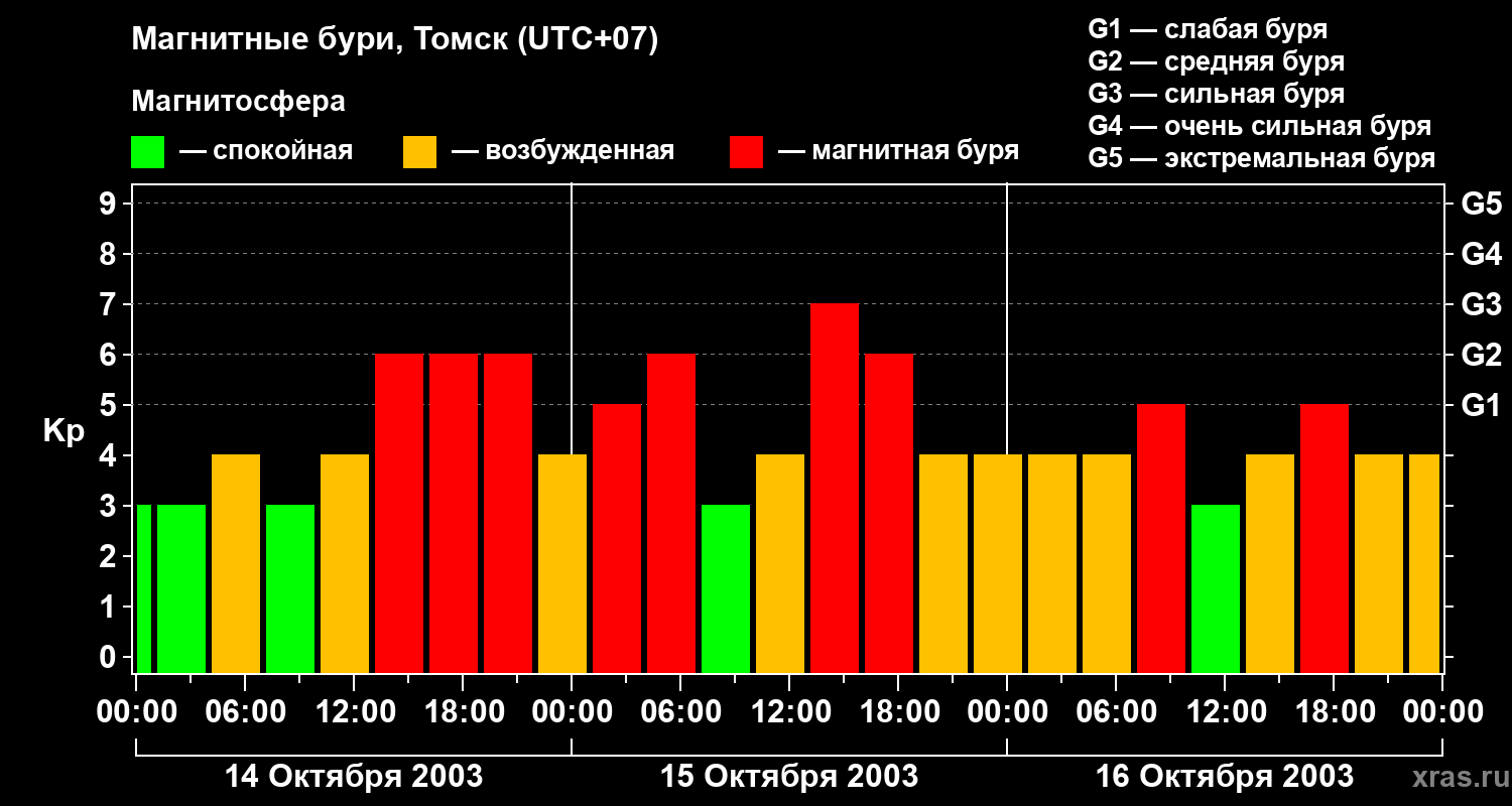 Изменения геомагнитного индекса Kp с 14 по 16 октября 2003 года для средних широт